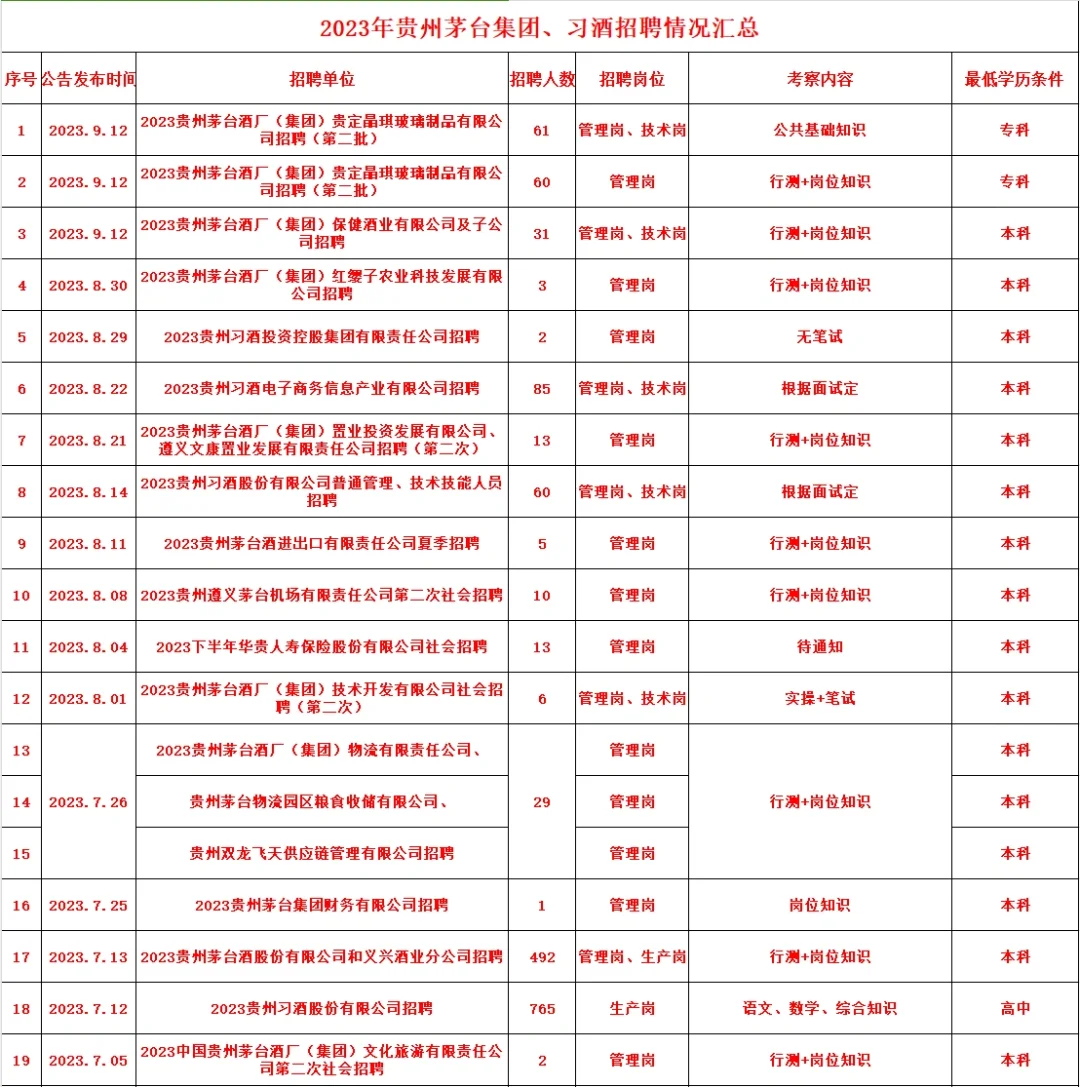 >茅台,习酒2022/2023招聘情况