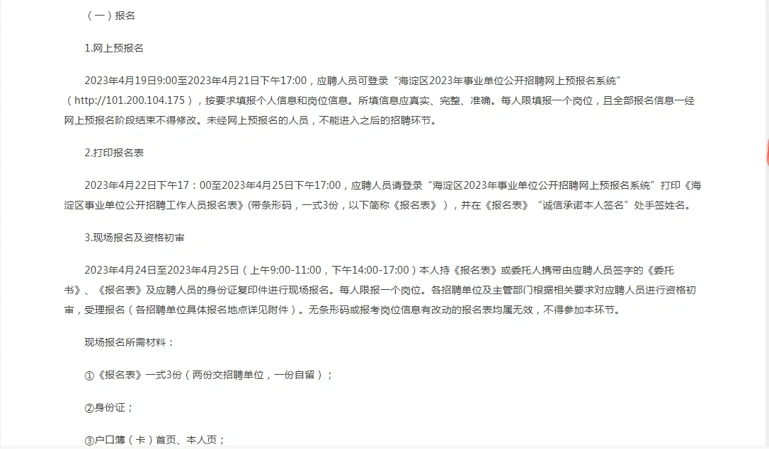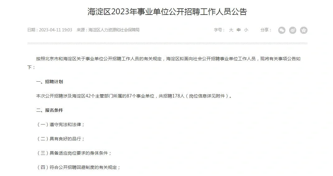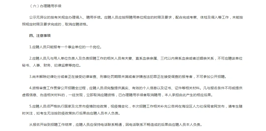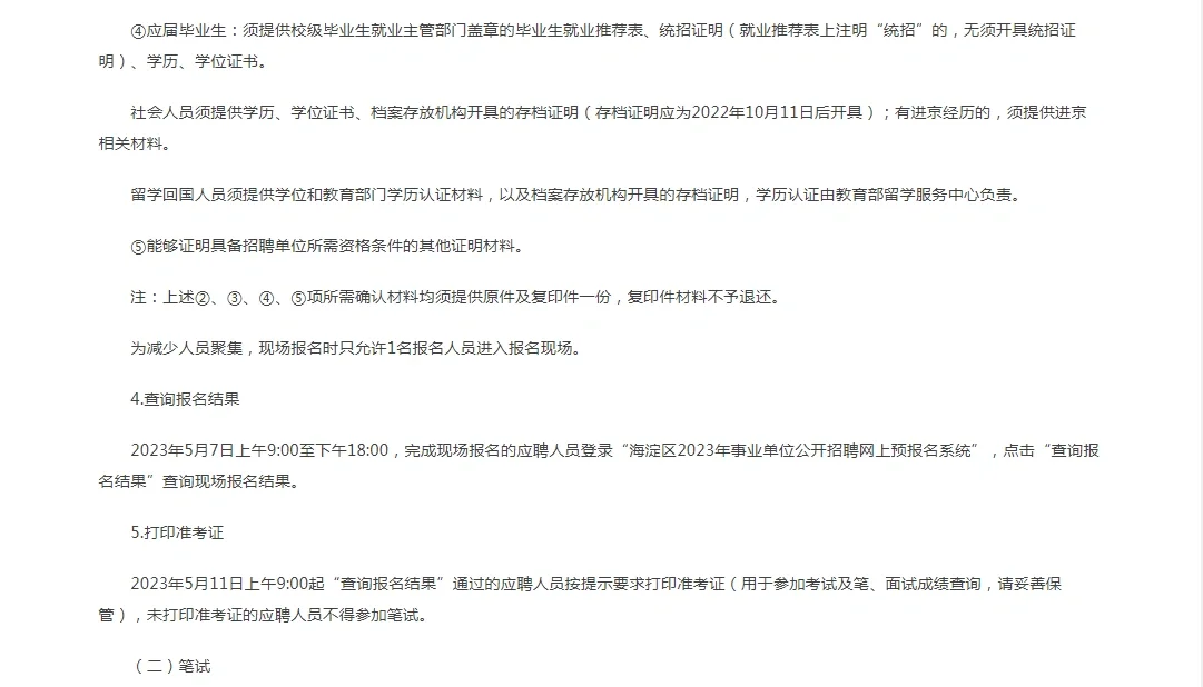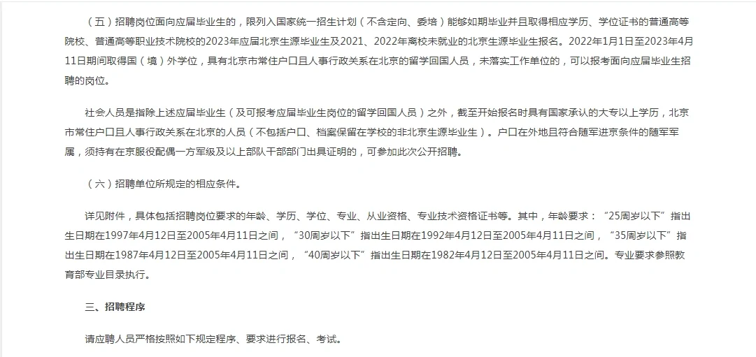 (五)招聘岗位面向应届毕业生的,限列入国家统一招生计划(不含定向、委培)能够如期毕业并且取得相应学历、学位证书的普通高等院校、普通高等职业技术院校的2023年应届北京生源毕业生及2021、2022年离校未就业的北京生源毕业生报名。2022年1月1日至2023年4月11日期间取得国(境)外学位,具有北京市常住户口且人事行政关系在北京的留学回国人员,未落实工作单位的,可以报考面向应届毕业生招聘的岗位。