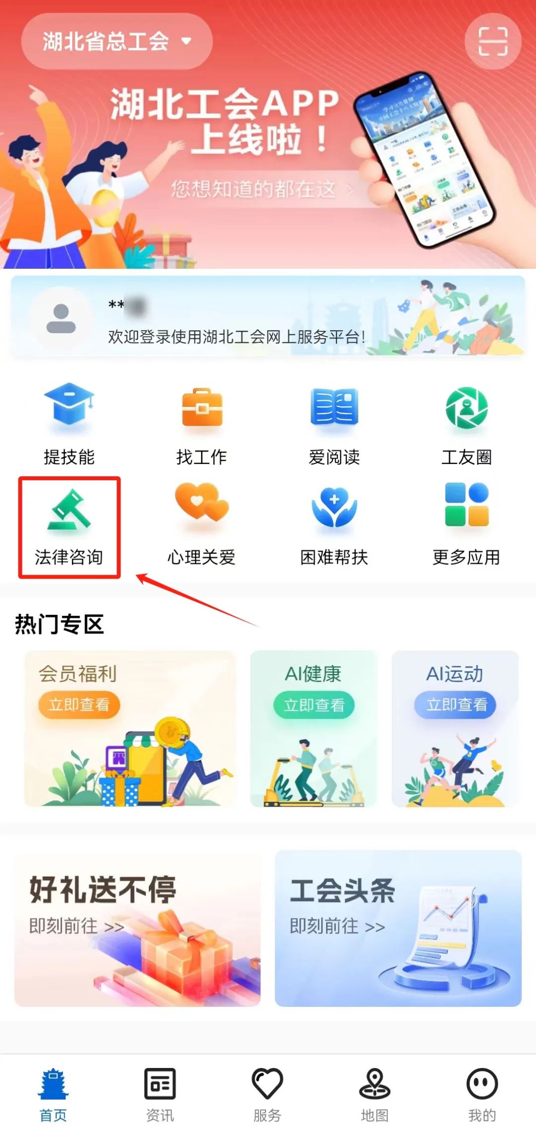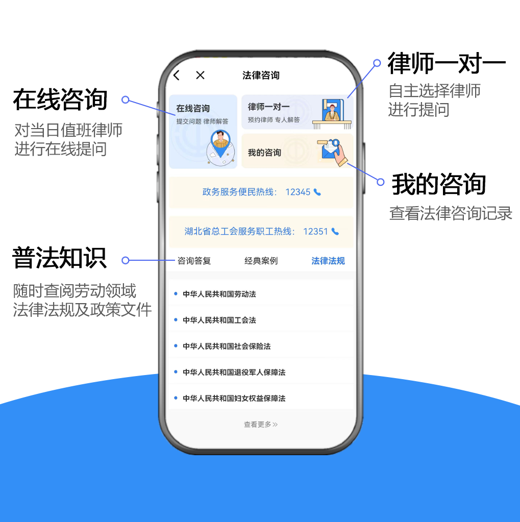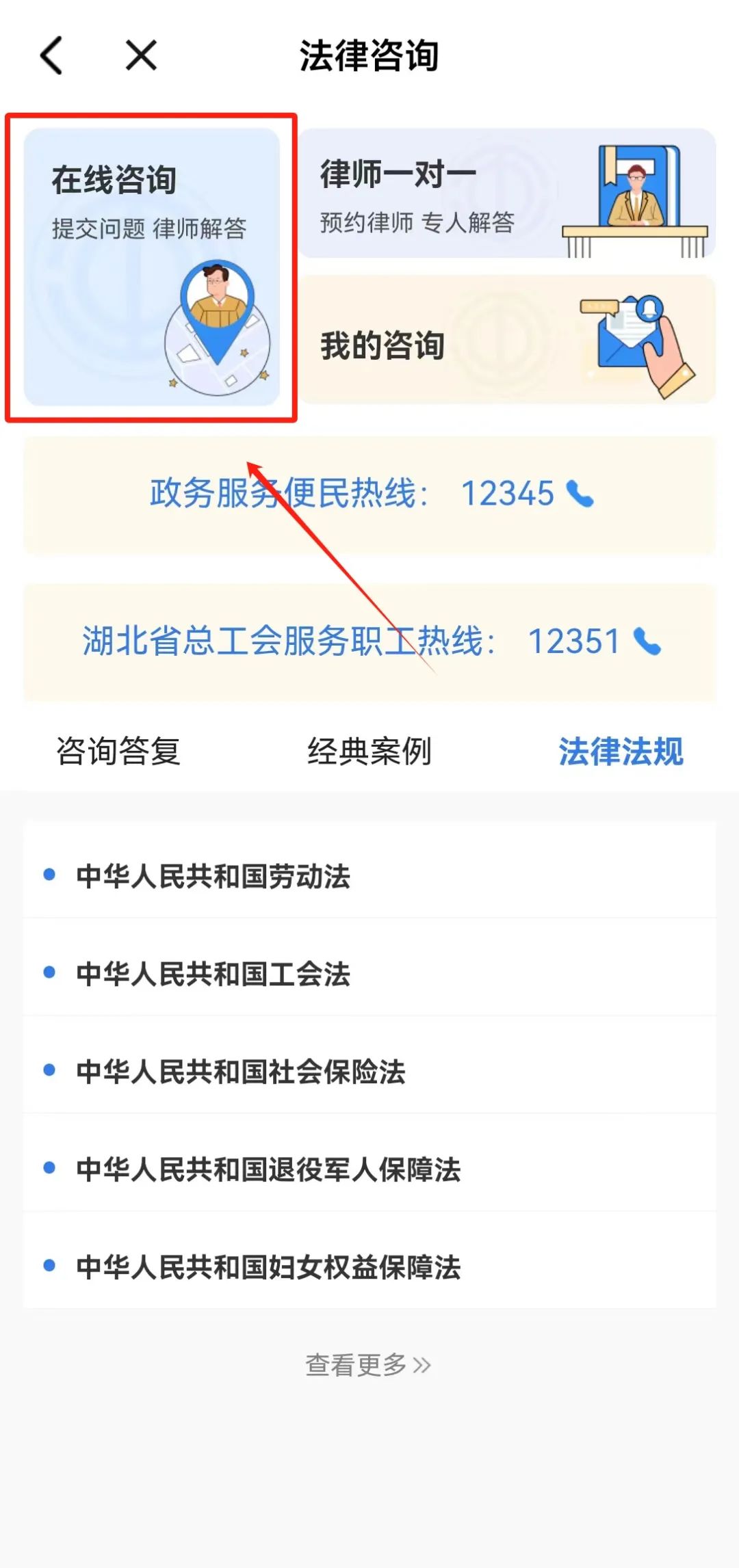 “法律咨询”是免费的线上法律服务专区,分为咨询服务和普法知识两大功能区,也可拨打政务服务便民热线12345,或湖北省总工会服务职工热线12351。