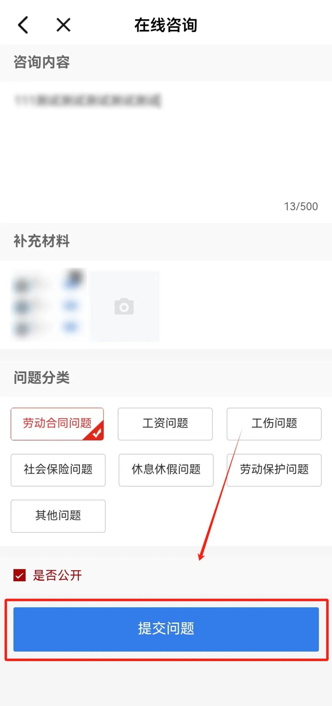 在“法律咨询”专区,点击“在线咨询”,按提示填写咨询内容,上传补充材料,选择问题分类及是否公开,“提交问题”即可。