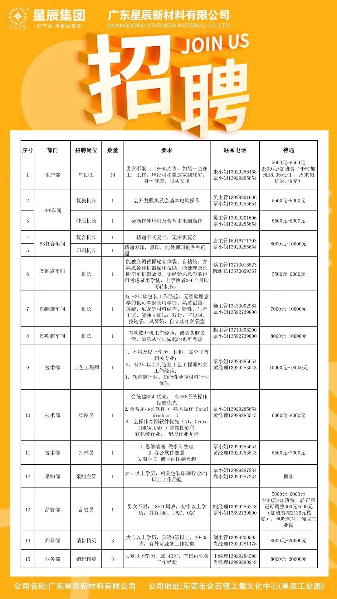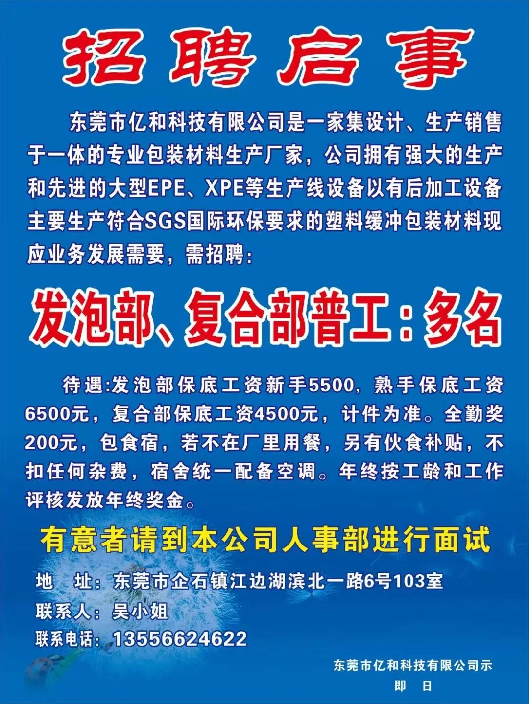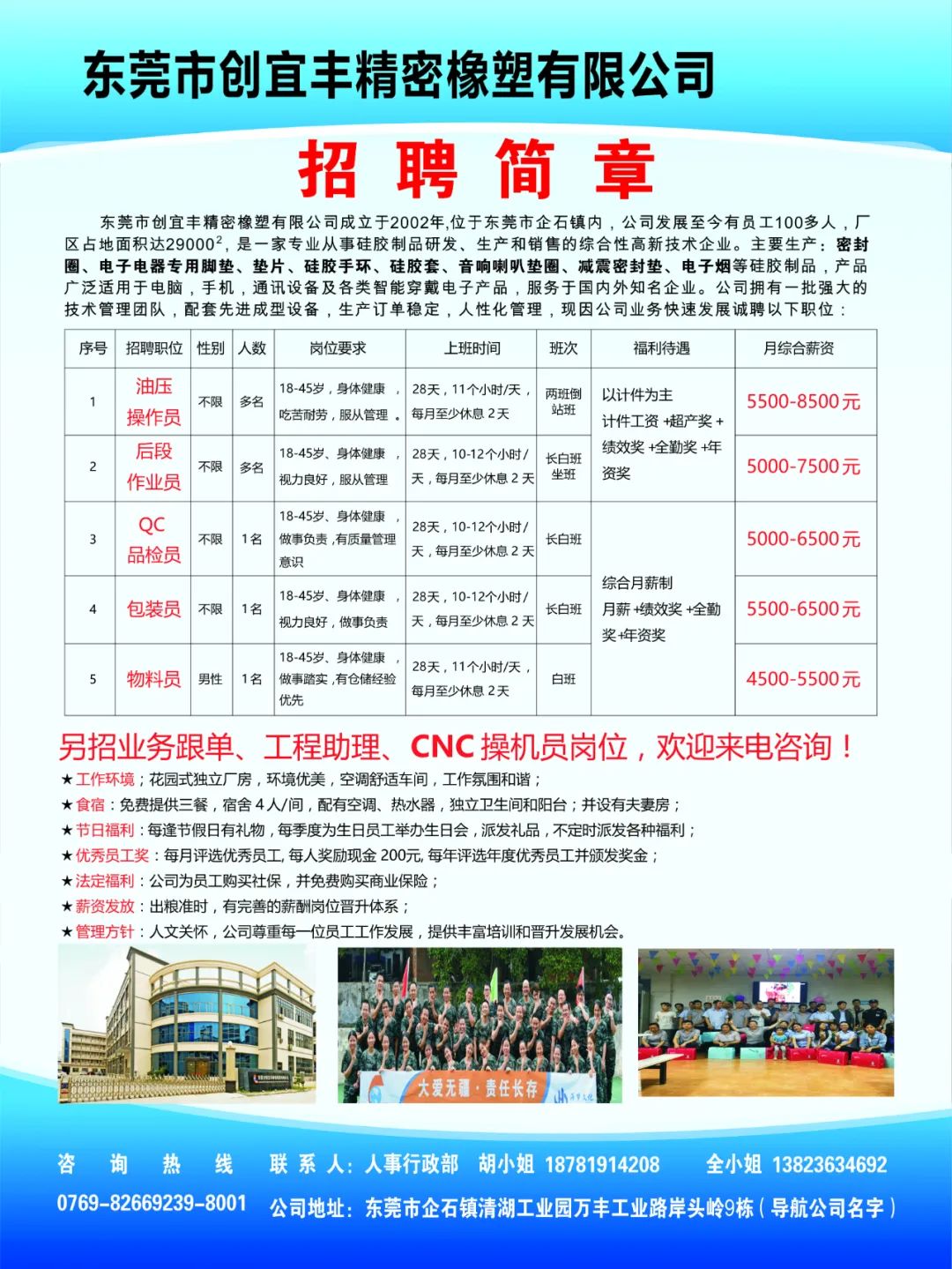 我司主要生产:两轴三轴四轴高速全自动流延缠绕膜机组、CPE/PEVA /CPP多层共挤流膜机组,智能化全自动拉伸缠绕膜(保鲜膜)机组等高端流延膜装备,现工厂扩大诚聘:【1】机械制图员/助理工程师3名 7K-8K/月.【2】机械工程师2名 15K-20K/月(塑料挤出机械设计经验/流延薄膜/片板材/挤出吹塑/挤出淋覆等行业优先。能独立承担挤出机系统,成型系统,收卷系统,辅助系统的设计)【3】外贸业务8K-10K+1.5-2%(提成)【4】国内业务6K-10K+1-1.5%(提成)【5】焊工师傅3名 8K-12K/月(有焊工证、熟悉焊接工艺图,试用期后不保底无底薪计件)【6】CNC操作员2名 6K-8K/月(有夜班)【7】CNC学徒1名 5K-6K/月(有夜班)【8】PMC 2名8K-10K/月【9】仓管员2名 5.5K-6K/月(会开3吨叉车者优先考虑)【10】品管员3名 6K-8K/月(机械装配、焊接工艺熟悉)【11】装配钳工师傅4名 8K-12K/月(整机机械装配,试用期后不保底无底薪计件)【12】研发文员1名 4.5K-5.5K/月【13】电气工程师助理 7K-8K/月【14】普工1名 5K-6K/月【15】下料工1名 5K-6K/月,有机械五金行业工作经验投递简历即可面试。包食宿、环境优美、入职就买五险、全勤奖、绩效奖、生日会奖、优秀员工奖、年终奖等。广东省东莞市企石镇莫屋基围工业路3号,0769-82816015/18046936386/欧小姐(微信同号)