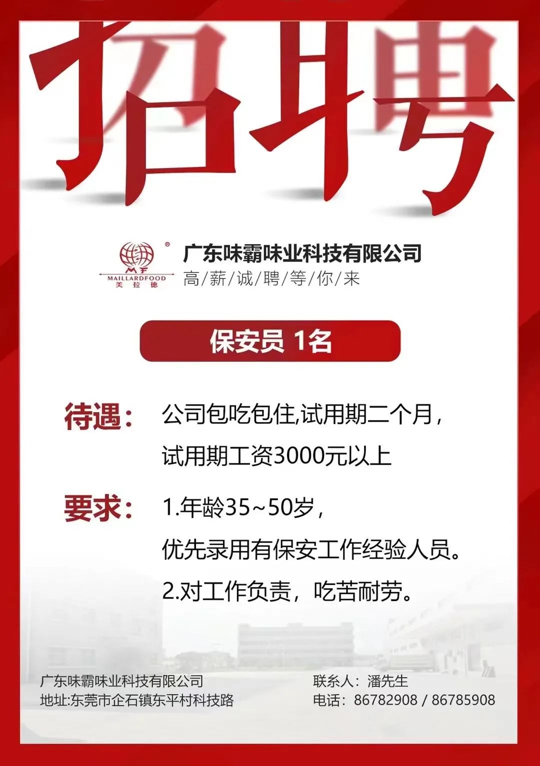 诚聘保安员:一、岗位要求:男性,18-50周岁,身高168cm及以上,东莞本地户口,粤语流利,身体健康,能吃苦耐劳,无违法犯罪记录和纹身,形象气质佳,服务意识好。二、工作时间:5天半,具体根据银行排班轮班轮休,;三、工资结构:面议;四、工作地点:东莞农村商业银行企石支行,欢迎转发,推荐。联系人:姚生电话86665682