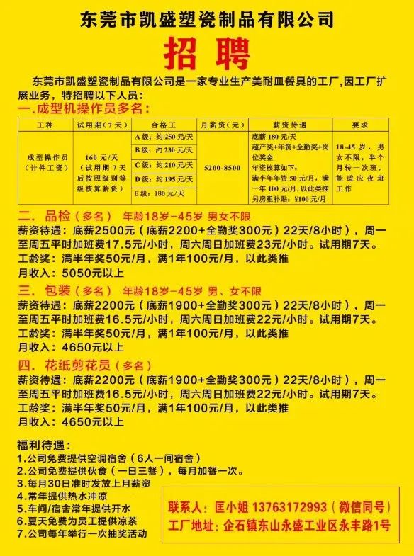 企石灯饰厂急招聘.临时工3名,男女不限18-40岁 16元/小时 ,每天8小时-11小时,正式工1名,女士优先18-38岁17元/小时,另有全勤奖100元,主要打包装,检验,比较简单的事情,小白易上手!包吃中餐、晚餐。上班时间:周一到周六,地址:宝石加油站附近,联系人 袁小姐13544797021微信同步