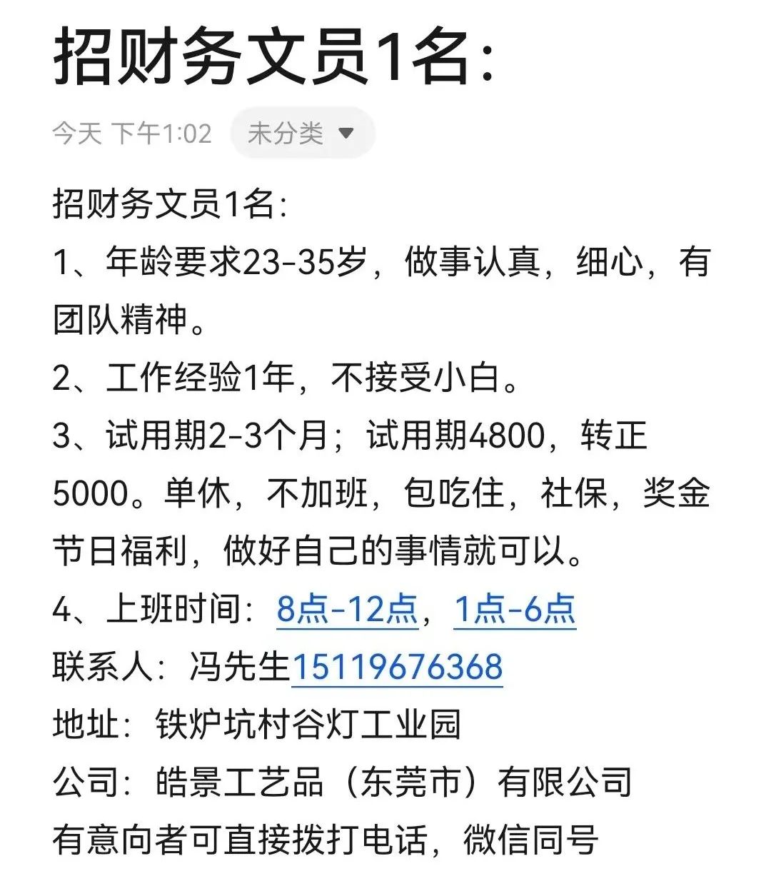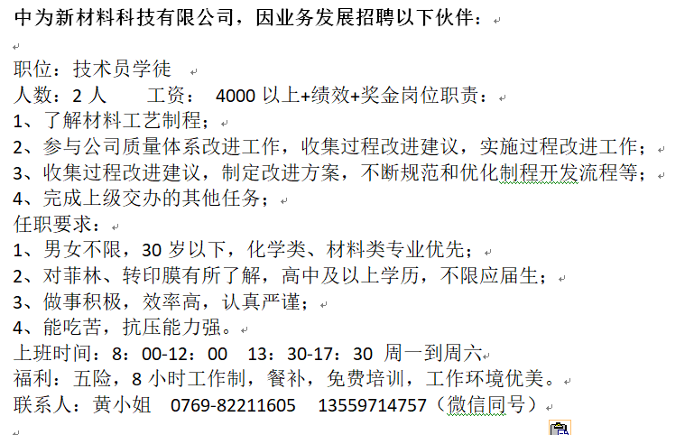 招聘:财务文员、客服文员.要求:1、熟练运用 OFFICE 办公软件。2、中专以上学历。3、有1年以上财务或快递行业工作经验者优先。4、工作仔细认真、责任心强、为人正直。薪资福利:4600-6000,月休4天(包吃住,工资准时发放)上岗地址:财务文员企石镇、客服文员横沥镇。联系电话:15989666202翟小姐(微信同步)