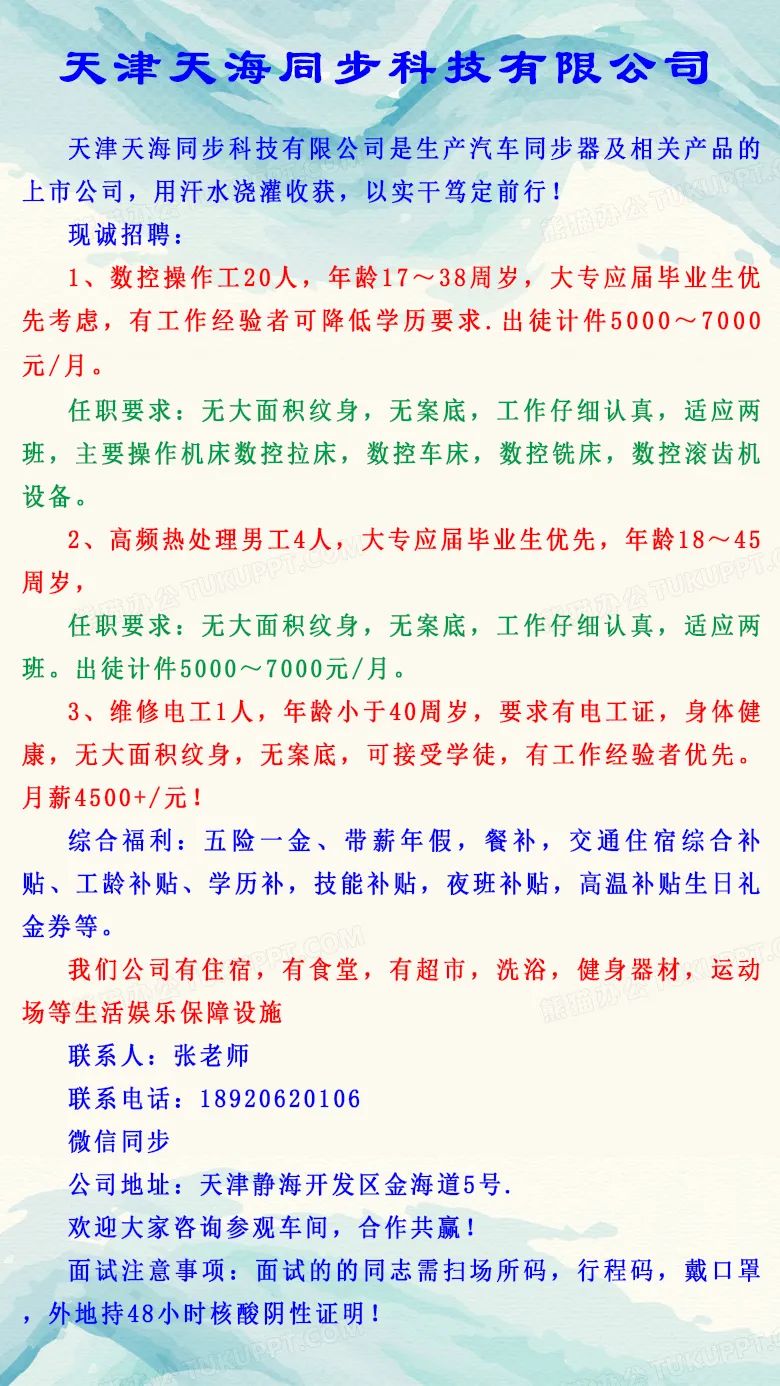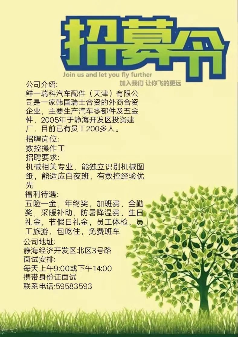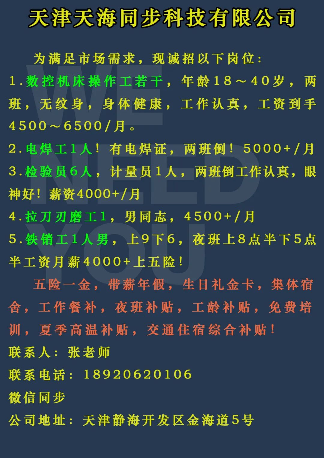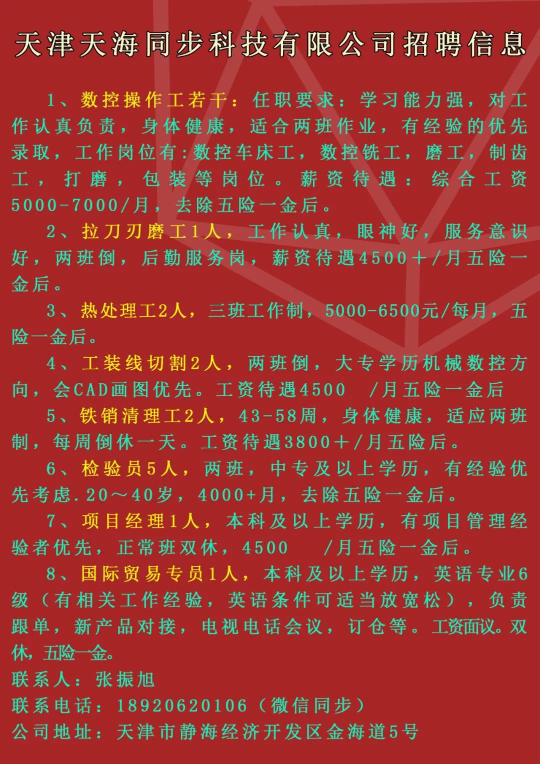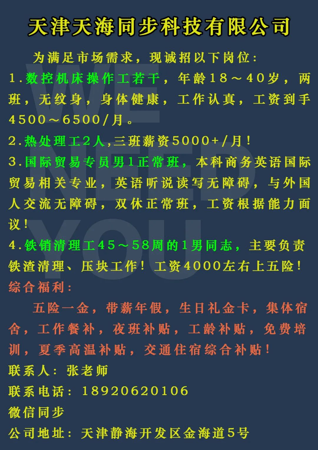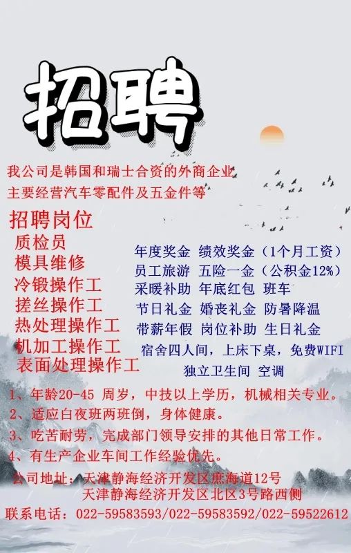 | 天津天海精密锻造有限公司 | 检验员1 数控车工15 包装工4 机修工1