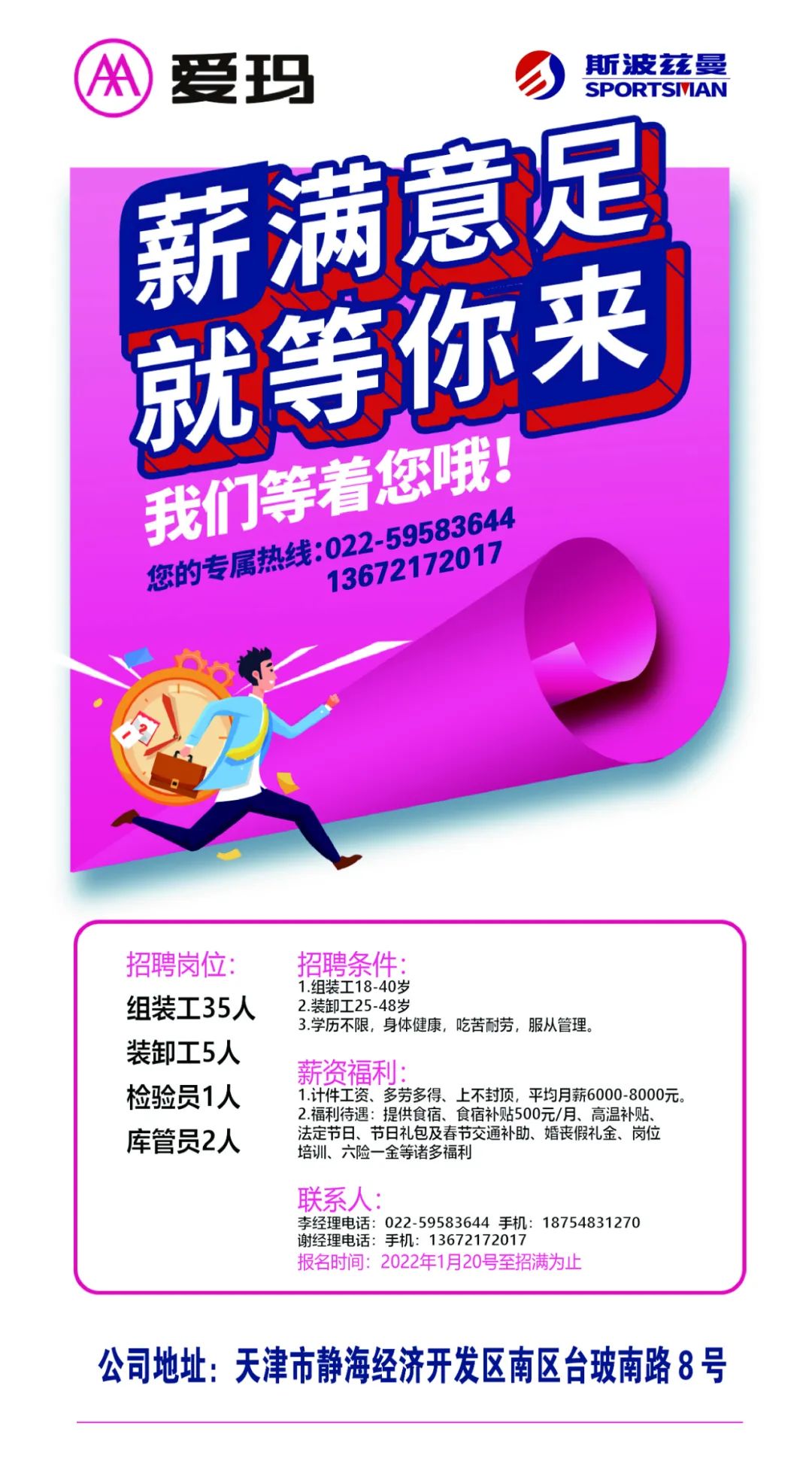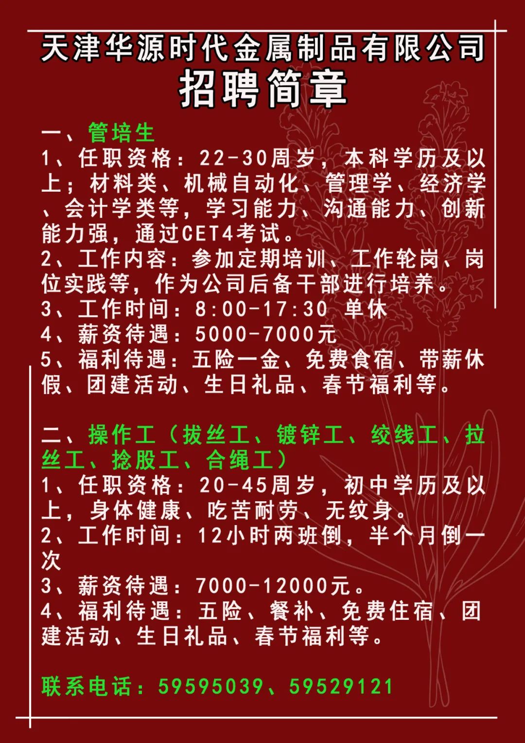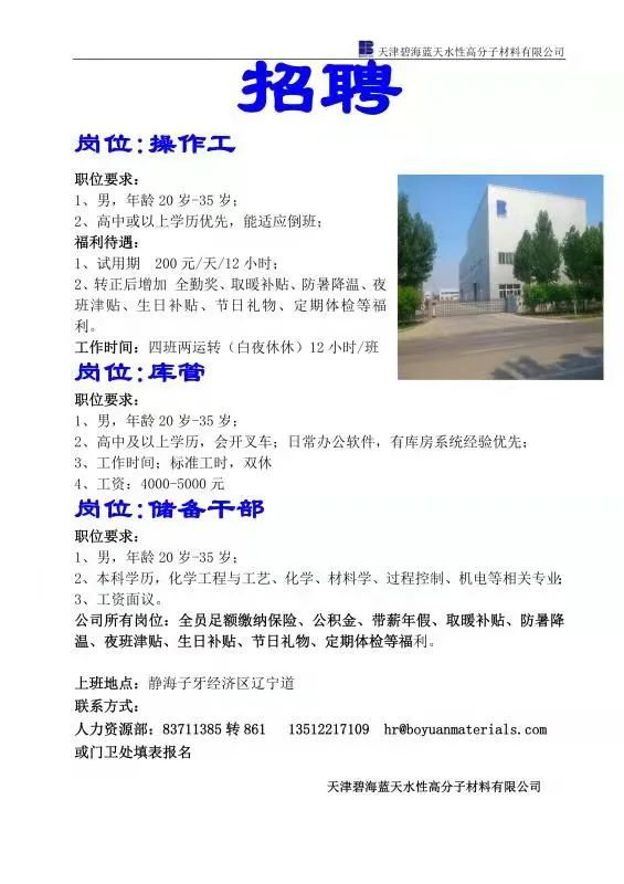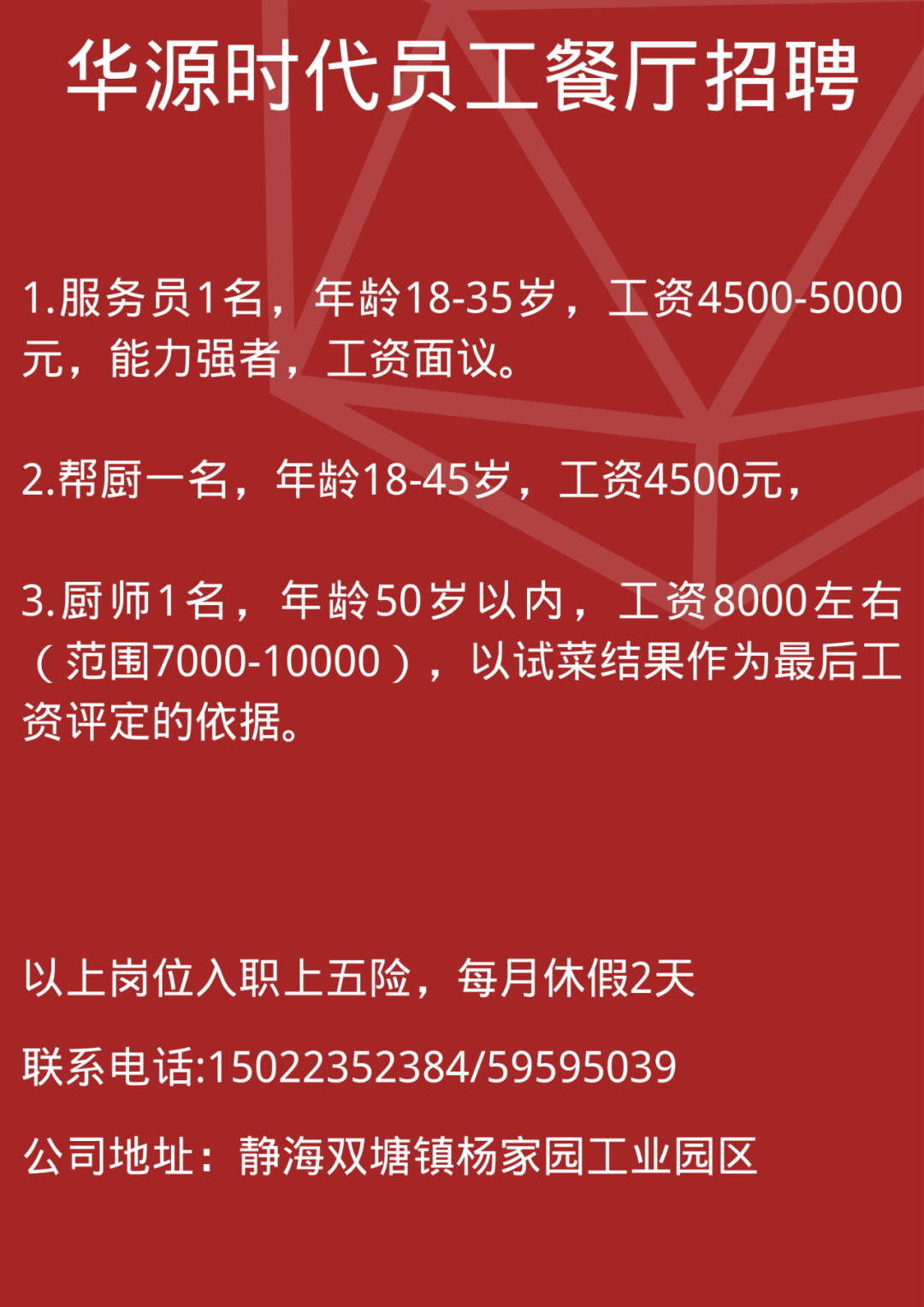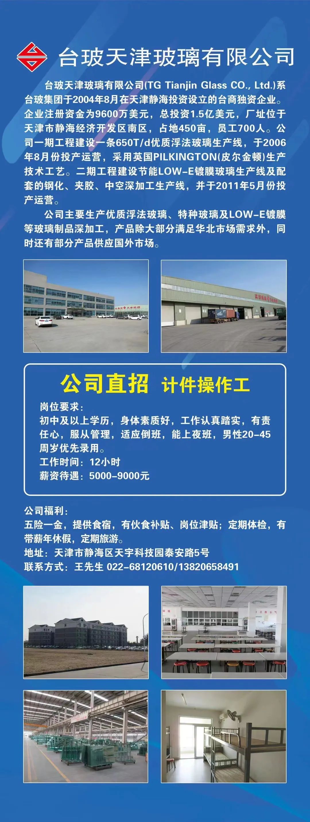 | 13672172017 | 工资5000左右,要求男性18-45岁,试用期一个月,成熟的晋升机制,节日福利,期待您的加入。电话: 地址:经济开发区南区台玻南路8号 |