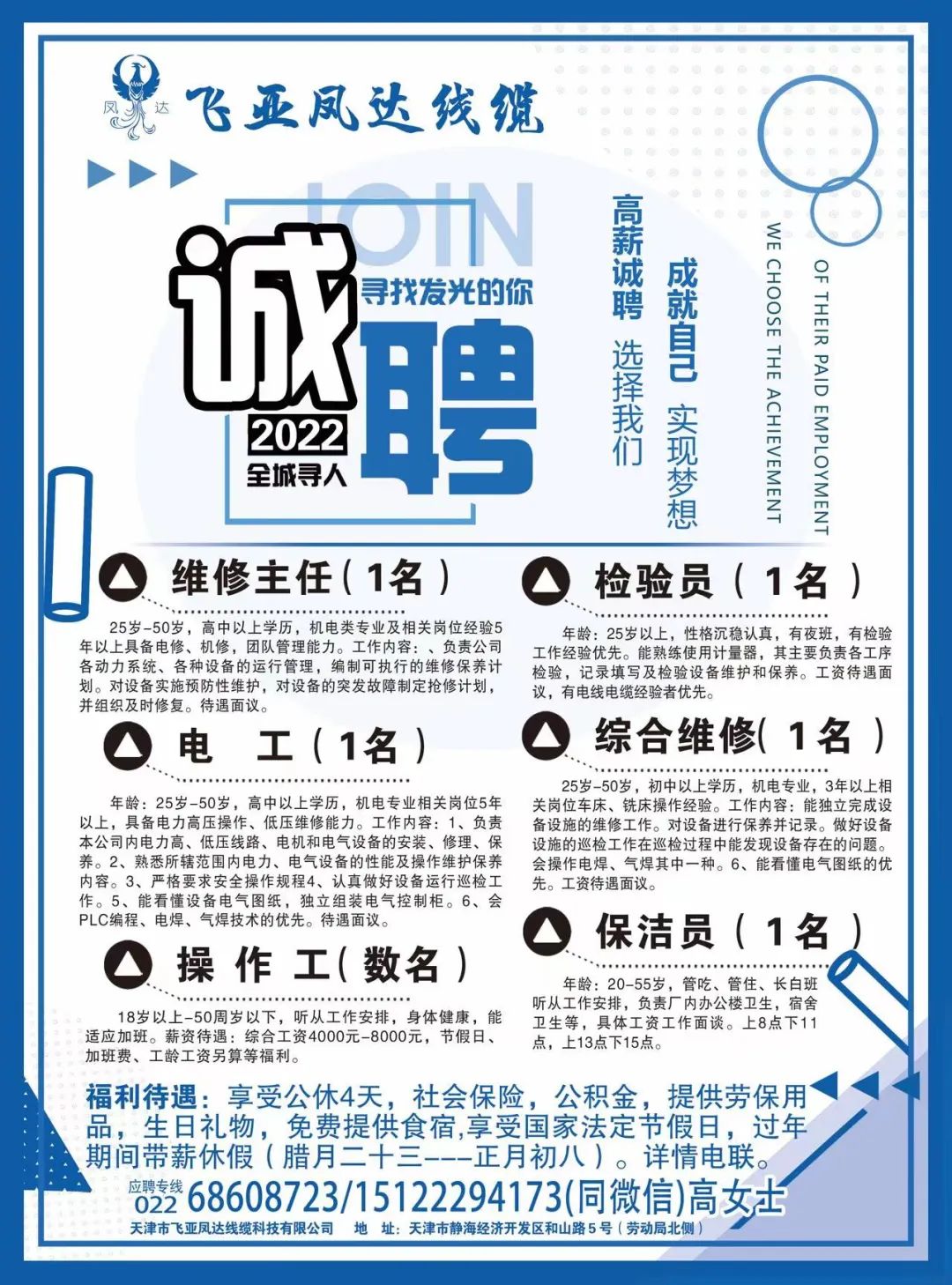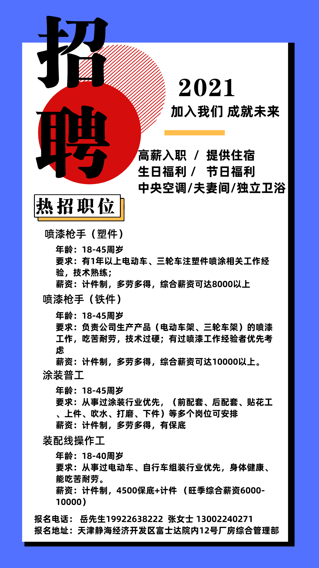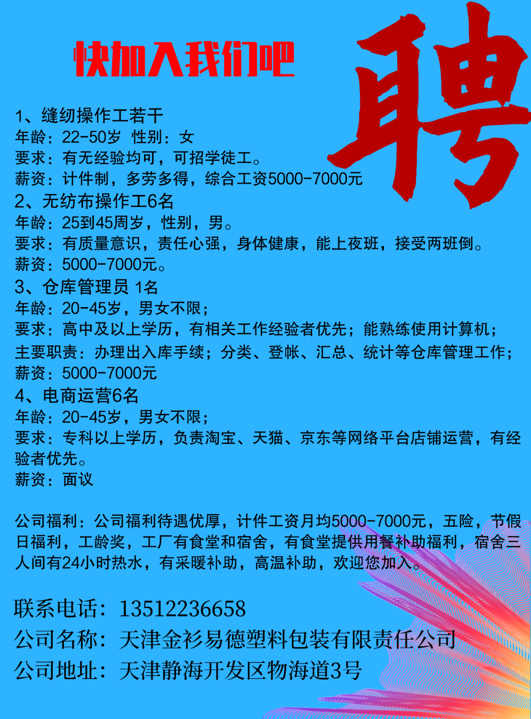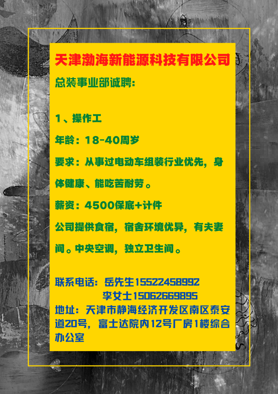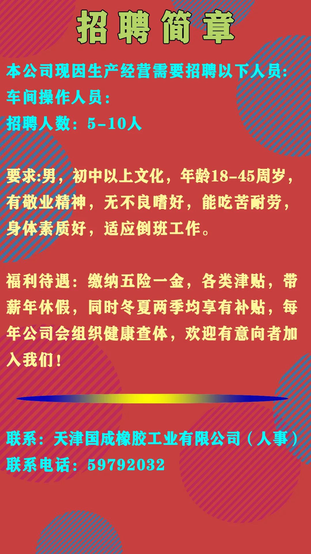 | 13672172017 | 工资5000左右,要求男性18-45岁,试用期一个月,成熟的晋升机制,节日福利,期待您的加入。电话: 地址:经济开发区南区台玻南路8号 |