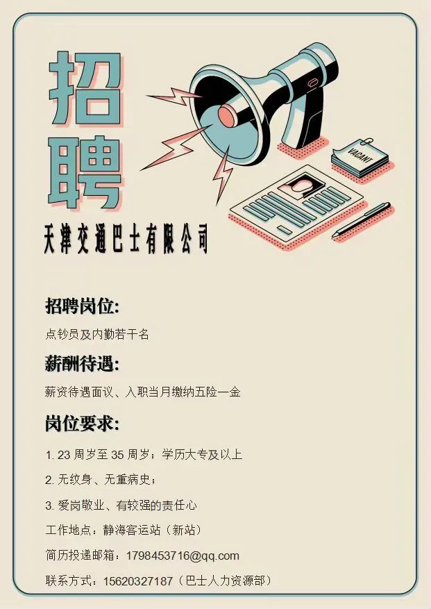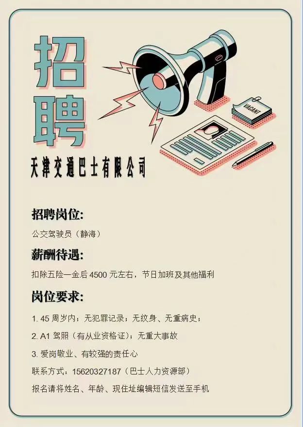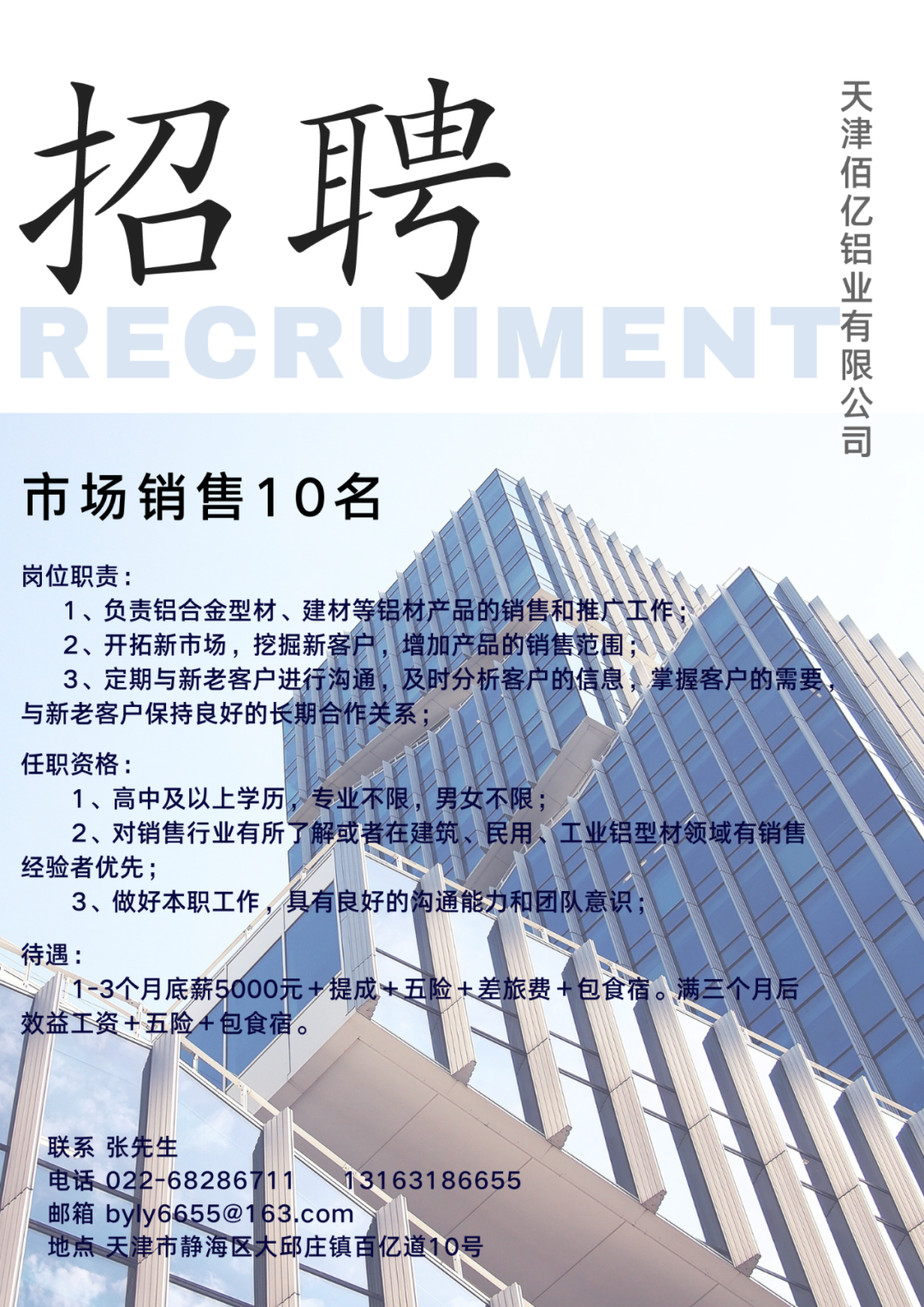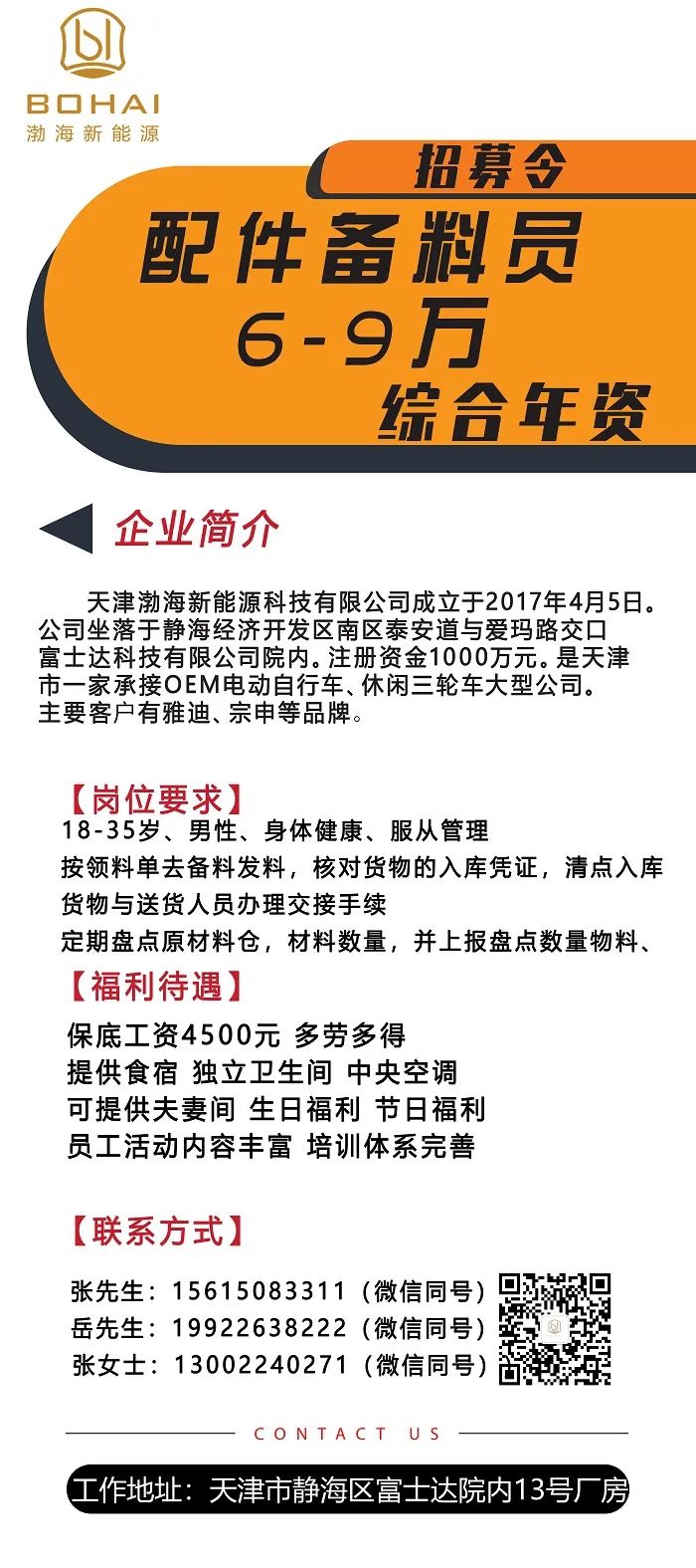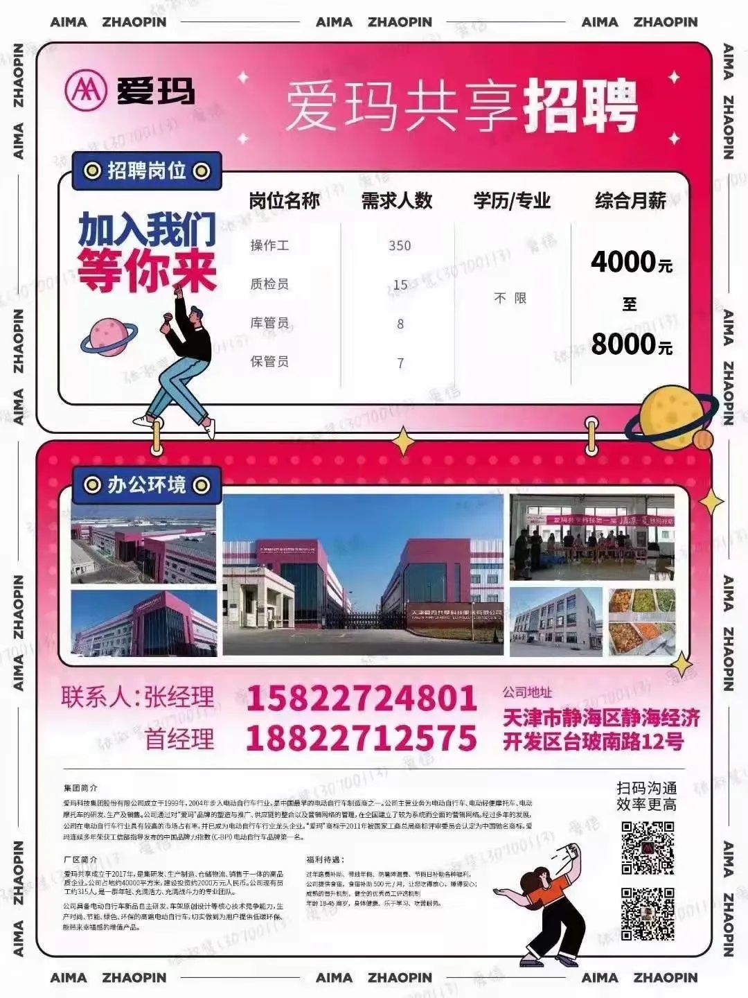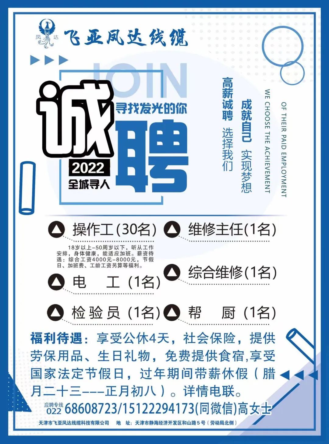 | 13672172017 | 工资5000左右,要求男性18-45岁,试用期一个月,成熟的晋升机制,节日福利,期待您的加入。电话: 地址:经济开发区南区台玻南路8号 |