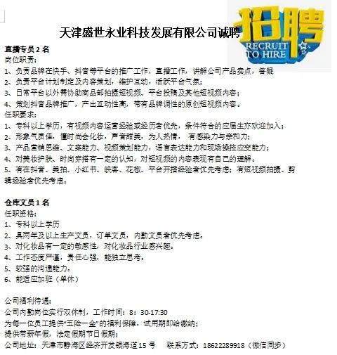 | 男 女 各 10 名 | 18622289918 | 包装的活,可坐可站,环境良好,年龄20-38 岁 上8点15下17点,能适应加班,加班不超过晚上8点30.周末休息 流水线集体计件,平均工资3000-4000.有午餐,带薪年假,季节性补贴。入职就缴纳五险一金 |