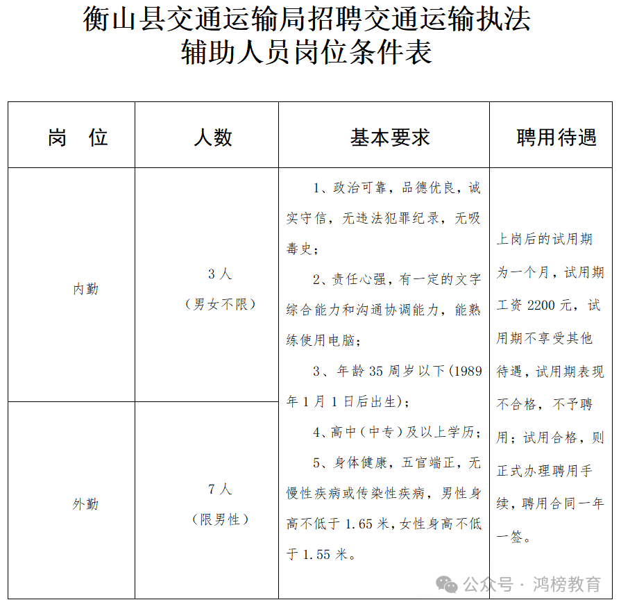 3.要求:报名时须提供本人毕业证书、有效身份证、户口本原件及复印件;无犯罪记录证明;自行下载打印并填写好《衡山县交通运输局招聘交通运输执法辅助人员》(详见附件);本人近期同底免冠1寸照片2张。