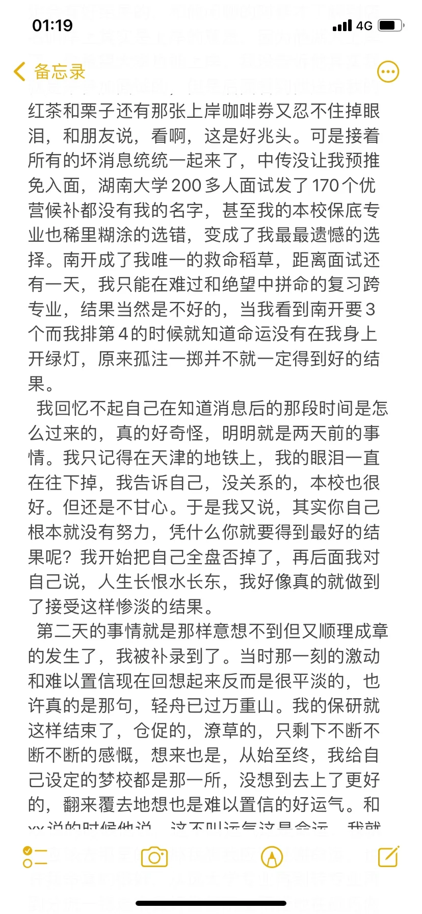 我回忆不起自己在知道消息后的那段时间是怎么过来的,真的好奇怪,明明就是两天前的事情。我只记得在天津的地铁上,我的眼泪一直在往下掉,我告诉自己,没关系的,本校也很好。但还是不甘心。于是我又说,其实你自己根本就没有努力,凭什么你就要得到最好的结果呢?我开始把自己全盘否掉了,再后面我对自己说,人生长恨水长东,我好像真的就做到了接受这样惨淡的结果。