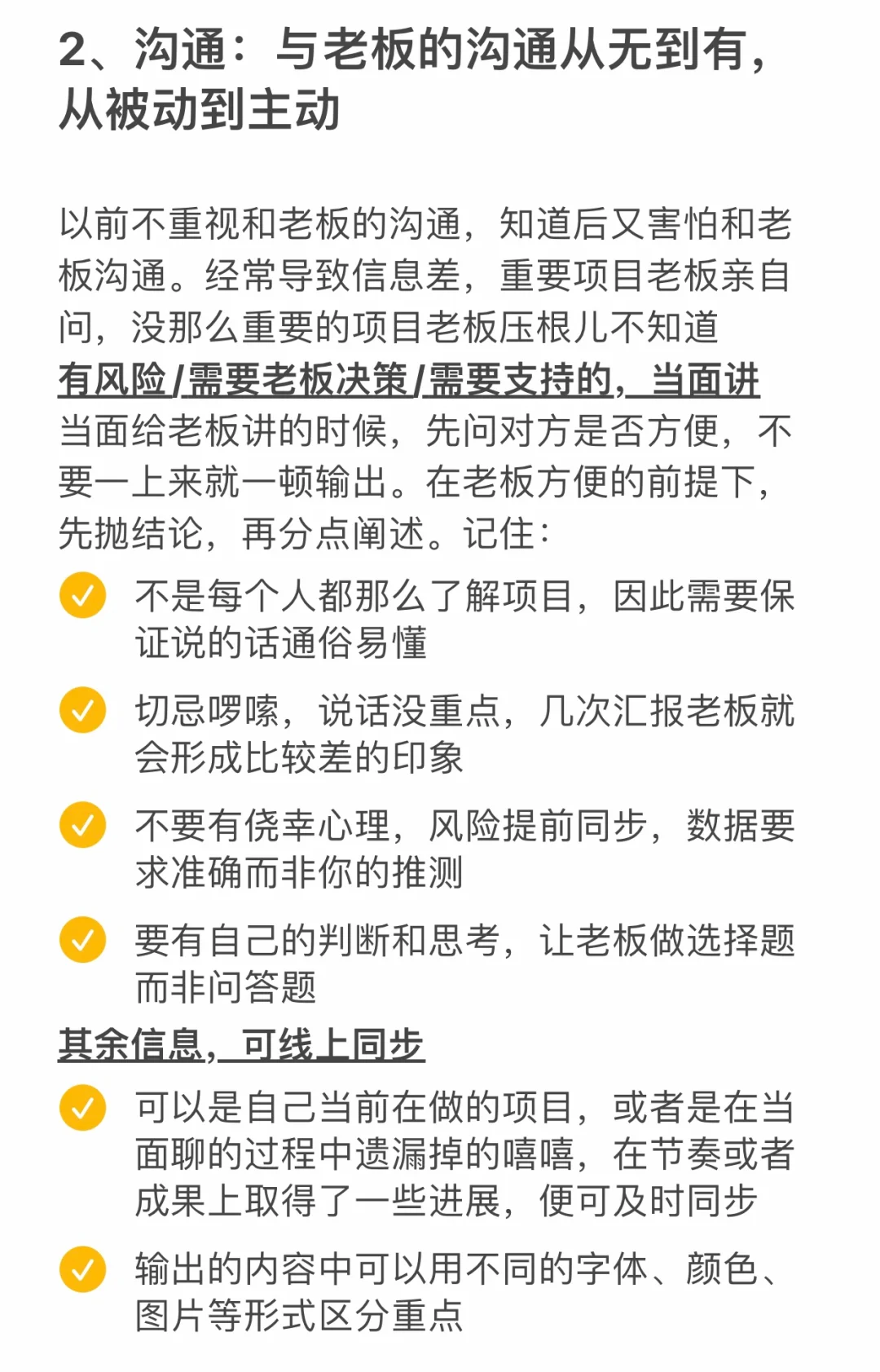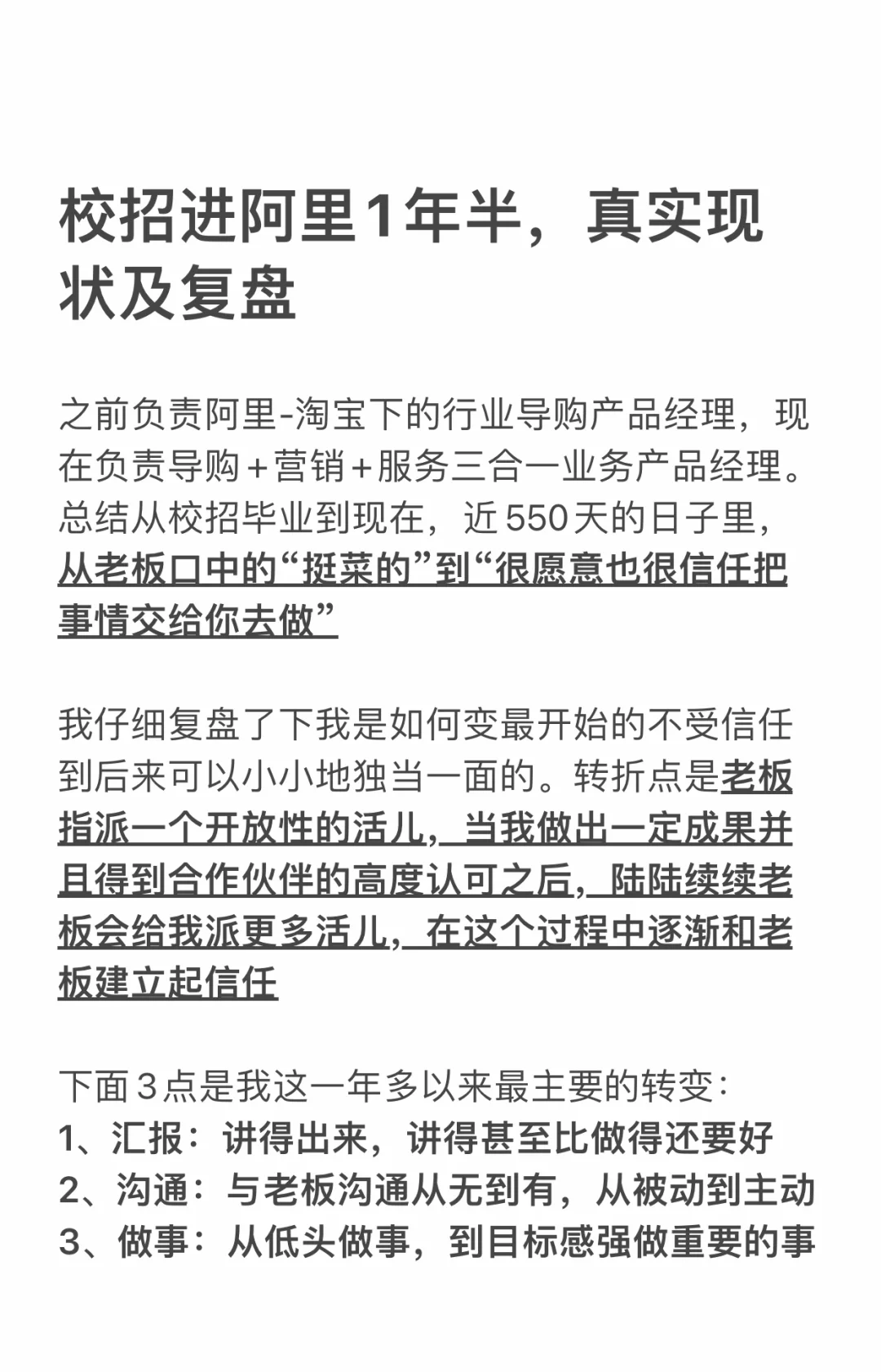 转折点是老板指派一个开放性的活儿,当我做出一定成果并且得到合作伙伴的高度认可之后,陆陆续续老板会给我派更多活儿,在这个过程中逐渐和老板建立起信任