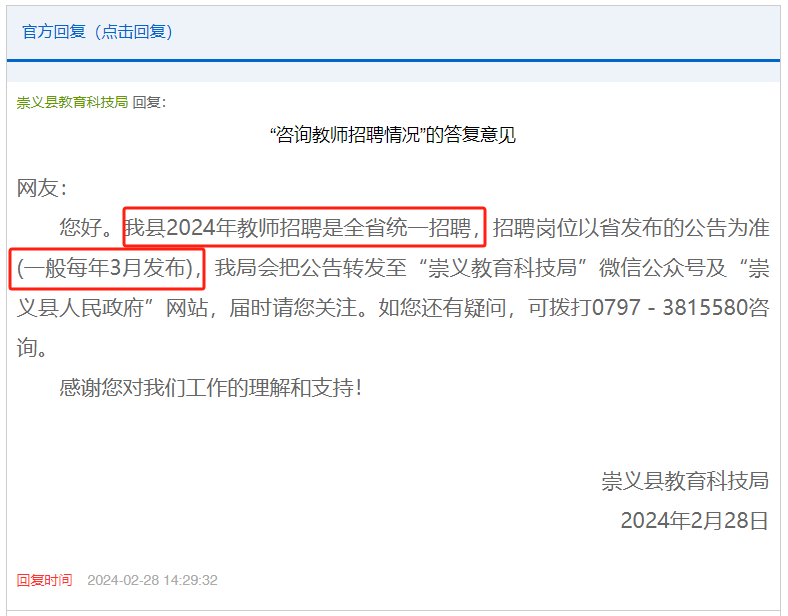 您好。我县2024年教师招聘是全省统一招聘,招聘岗位以省发布的公告为准(一般每年3月发布),我局会把公告转发至“崇义教育科技局”微信公众号及“崇义县人民政府”网站,届时请您关注。如您还有问,可拨打0797-3815580咨询。