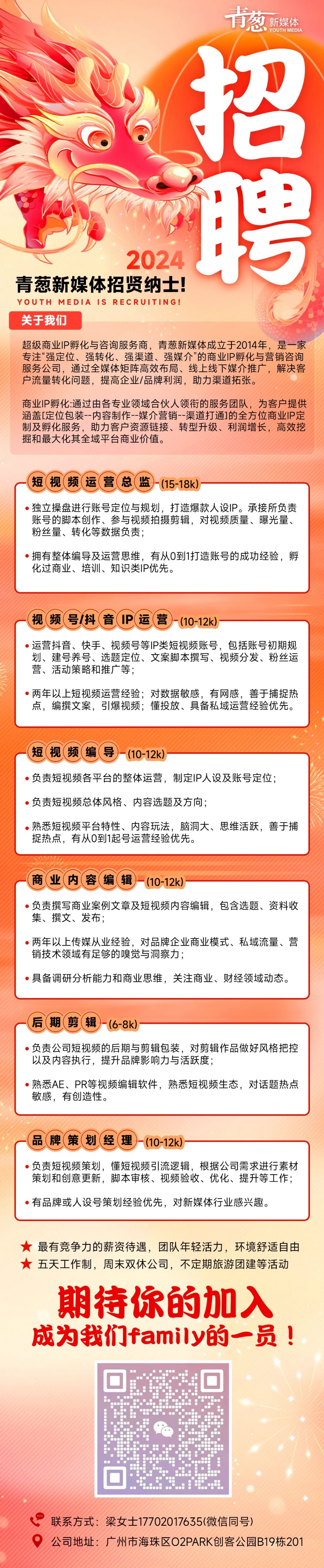 【广州招聘】周末双休!月薪8k-18k+奖金+福利+晋升快.青葱新媒体招贤纳士!