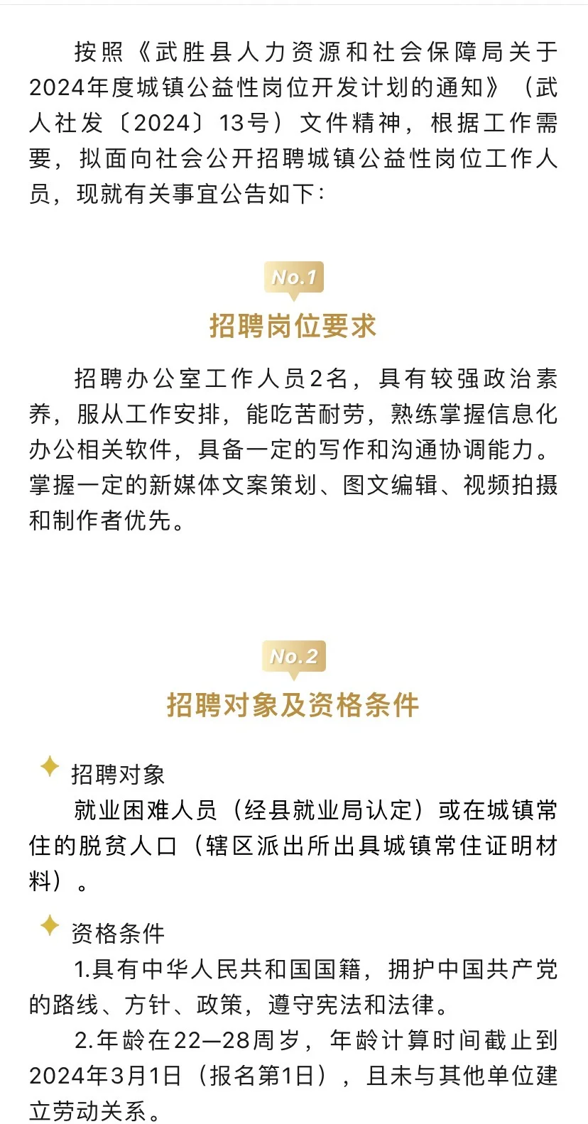 武胜团县委拟面向社会公开招聘城镇公益性岗位工作人员,办公室工作人员2人。