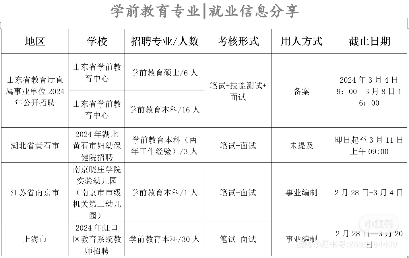 陕西省、山东省、湖北省、江苏省、上海市招聘学前教育专业教师,部分地区带编制,具体信息见图。