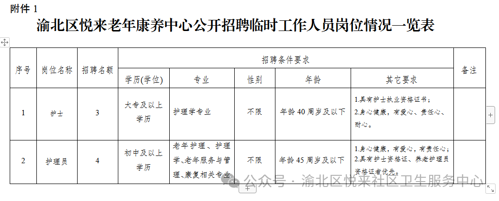 2.报名手续及资格审查。报考者只能选择一个岗位报名,在报考同一岗位的人员内竞争。报考者根据报考岗位及要求,将《报名表》(见附件)、本人毕业证、学位证、身份证、岗位要求的资格证书和其他报考所需证明材料等原件及其复印件各1份、近期同底1寸免冠彩色照片2张交到渝北区悦来老年康养中心三楼办公室进行资格初审。