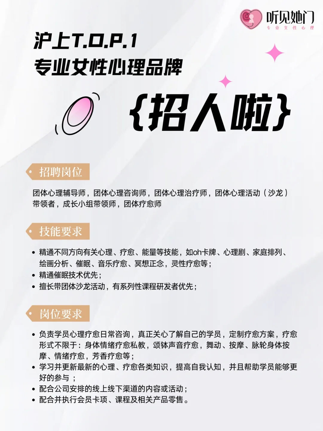 上海专业女性心理品牌招人啦❗❗ 📍听见她门是中国「女性情绪疗愈开创者」,是全国第一家「专注女性的心理疗愈品牌」,我们坚信每个女生都值得被听见、被看见、被理解。我们相信,一切改变从被听见开始。 - 💎为了更好的为更多女性服务,我们将在新的一年围绕【重新养育自己】为大家提供100+场女性沙龙,现在寻找更多同频的老师加入我们,具体要求如下: - 🎬【招聘岗位】 团体心理辅导师,团体心理咨询师,团体心理治疗师,团体心理活动(沙龙)带领者,成长小组带领师,团体疗愈师; 🎬【技能要求】 精通不同方向有关心理、疗愈、能量等技能,如,oh卡牌、心理剧、家庭排列、绘画分析、催眠、音乐疗愈、冥想正念,灵性疗愈等; 精通催眠技术优先; 擅长带团体沙龙活动,有系列性课程研发者优先; 🎬【岗位要求】 负责学员的心理疗愈日常咨询,真正关心了解自己的学员,定制疗愈方案,疗愈形式不限于身体情绪疗愈私教,颂钵声音疗愈,舞动、按摩、脉轮身体按摩情绪疗愈,芳香疗愈等; 学习并更新最新的心理、疗愈各类知识,提高自我认知,并且帮助学员能够更好的参与 ; 配合公司安排的线上线下渠道的内容或活动; 配合并执行会员卡项、课程及相关产品零售。 - 💌感兴趣的老师们可以滴滴我们啦~ #招聘 #上海招聘 #沙龙 #心理 #心理学 #情绪疗愈 #疗愈 #女性成长 #个人成长 #OH卡 #心理剧 #催眠 #冥想 #家庭排列 #绘画分析 #求职招聘 #招募令 #行业 #工作 #职场 #烟火向星辰所愿皆成真 |
