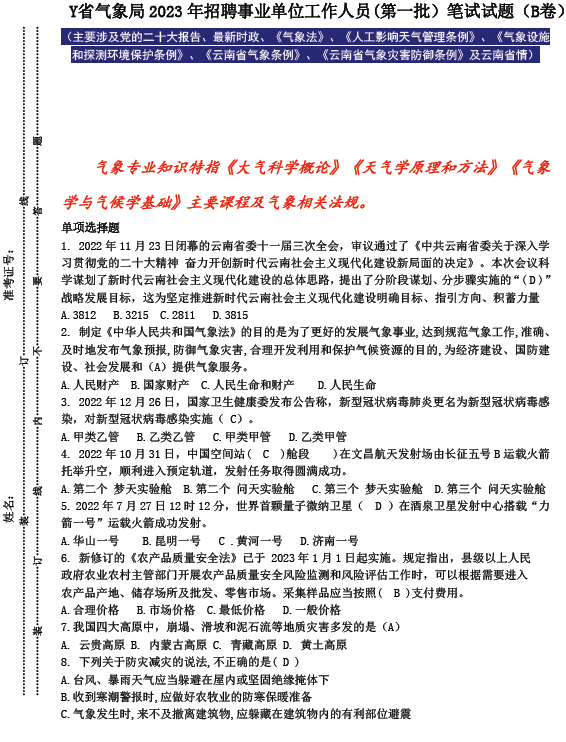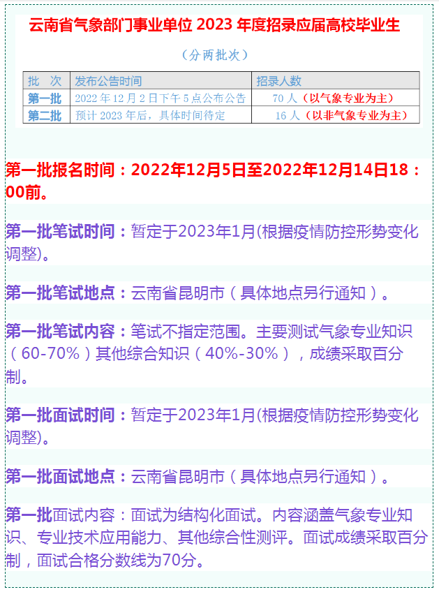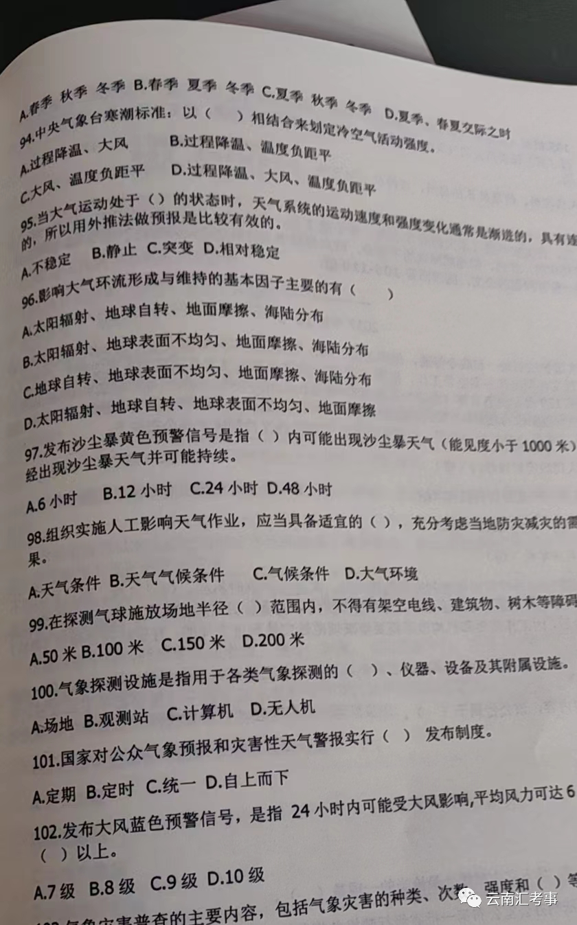 云南省气象局事业单位2024年招聘事业编制笔试往年真题历年试卷下载2024云南气象部门事业单位校园招聘笔试历年真题分析备考全攻略 气象局的招录人数在200-400人,相比其他单位来说招录人数少很多,虽然很多岗位都是只招1个人的,但由于受专业限制,报考人数相对较少,上岸概率更大。平均进面分数线处于中等水平。 气象局并不是很多同学以为的,只是做个天气预报。他还承担制定气象政策,防灾减灾规划,宣传科普,应对气候变化开发利用气候资源、人工影响天气等服务管理职能。日常中最主要的就是涉农保障,防雷防汛。工作内容相对比较简单、固定,没有其他单位繁忙,除了特殊极端恶劣天气,通常不需要加班,很适合追求稳定工作的同学。 ![]() ![]() 2023年,在新中国气象事业74周年之际,中国气象局是中国国家级别的气象行政管理部门,是中华人民共和国国务院直属事业单位,主要承担全国气象工作的政府行政管理职能,负责全国气象工作的组织管理。气象工作关系生命安全、生产发展、生活富裕、生态良好,做好气象工作意义重大、责任重大。要求广大气象工作者发扬优良传统,加快科技创新,做到监测精密、预报精准、服务精细,推动气象事业高质量发展,提高气象服务保障能力,发挥气象防灾减灾第一道防线作用,努力为实现中华民族伟大复兴的中国梦作出新的更大的贡献。 报考气象局,气象类专业对口还是比较重要。非气象专业也会有零星需求,诸如财会、行政、计算机等岗位。非气象专业的就职去向和任职要求可分为三类:办公室、政策法规处、计划财务处。 气象系统由于其特殊的管理体制,接受中国气象局和地方政府双重领导,故其工资由中央财政保障,绩效奖金在纳入地方考核后由地方财政保障。部分地方财政吃紧的省份不保障奖金部分,东南沿海地区收入普遍高于内地省份,年人均15万左右。基本养老保险、基本医疗保险、失业保险、工伤保险、生育保险,住房公积金健康体检、机关食堂、提供单身宿舍、通信/交通/劳保/取暖补贴、防暑降温费、工会福利。 新入职一年内为试用期。试用期工资在4000-5000元左右。正式转正后工资增加1500元至3000元。具体数额需根据学历水平、是否有工作经历、是否担任领导职务、相应的工龄、以及试用期满后转正定级的级别测算。 一般而言,我国各级气象局主要是由参照公务员法管理事业编制人员(此类人员要求参加每年国家公务员考试方可进入本单位)、国家气象事业专项编制人员(专项编制采用的是全国统一发布,在气象人才网发布招考公告,第二批招考就是专项气象编制)、地方气象事业编制人员(由地市级人事主管部门组织招考,俗称参加当地事业单位招考)、编制外聘用人员(一律实行聘用合同制临时工,聘用合同一年一签,聘用合同期最长不超过三年)四类构成。 气象招聘考试 有问必答 近来有不少应届毕业生考生在云南校园宣讲会 公众号里发私信里问,去气象局干气象工作,需要什么学历。为了满足读者要求,我们公众号云南校园宣讲会整理了部分气象局的招聘要求,供各位考生参考。 首先需要申明,气象局要分狭义和广义。狭义上,气象局只是气象行业的行政管理部门,工作人员是行政管理人员;而广义的气象局,是指整个气象系统,工作人员既包括气象类核心业务从业人员,当然也包括行政管理人员,人力财务信息后勤等辅助支持人员等等。 我们这里所说的“气象局工作”,是指广义气象局内的气象类核心业务工作。在此基础上,还有三个限定条件: 1、为气象系统的岗位,高校及其他系统的气象岗位不在此列; 2、为国家气象编制,不包括地方编制,其他用工方式; 3、针对应届毕业生。 根据上述限定条件,我们分析了近几年所有省级行政区气象局的招聘要求。总体而言,满足条件的气象局气象类核心业务从业人员的学历要求不低,绝大多数都要本科及以上学历,东部及中部地区已经逐渐上升到硕士研究生及以上学历。这和气象事业的“科技型”特点,和近几年气象院校人才培养的飞速进步等密切相关。当然,各地气象局的要求差别很大。限于篇幅,本文只展示典型Y省级行政区气象部门事业单位的特殊性进行分析。 最后的话 气象部门招录岗位覆盖省级气象局,以及市、县级气象局,学历要求以本科及以上位置,部分岗位要求硕士研究生及以上或大专及以上。岗位要求专业包括大气科学、应用气象学、气象技术与工程、地球系统科学、数学类、物理学类、电子信息类、计算机类、环境科学与工程类、地理科学类、海洋科学类、中国语言文学类、法学类,以及会计学、工商管理类、会计、财务管理、审计、审计学等。 通过专业要求我们也同时注意到,并非只有学习气象相关专业才能到气象部门工作,气象事业发展也越来越需要不同专业的优秀人才。 当前,我国正全力推进气象强国建设,奋力书写新时代气象事业发展新篇章。期待奋斗征程,有你的逐梦身影! ![]() 全套资料5本书籍 第二批笔试辅导资料:《云南省气象局事业单位往年真题》+《气象法规》+《气象专业知识题库》+《综合知识教材及题库》+《时政与二十大题库》 ![]() 辅导资料的特点 备受认可 紧扣命题考试大纲常考题型 短期提升短板 海量题目 6套试卷满足考生刷题需求 含6套考前冲刺押题试卷 精心设计 精选往年气象局事业单位常考题