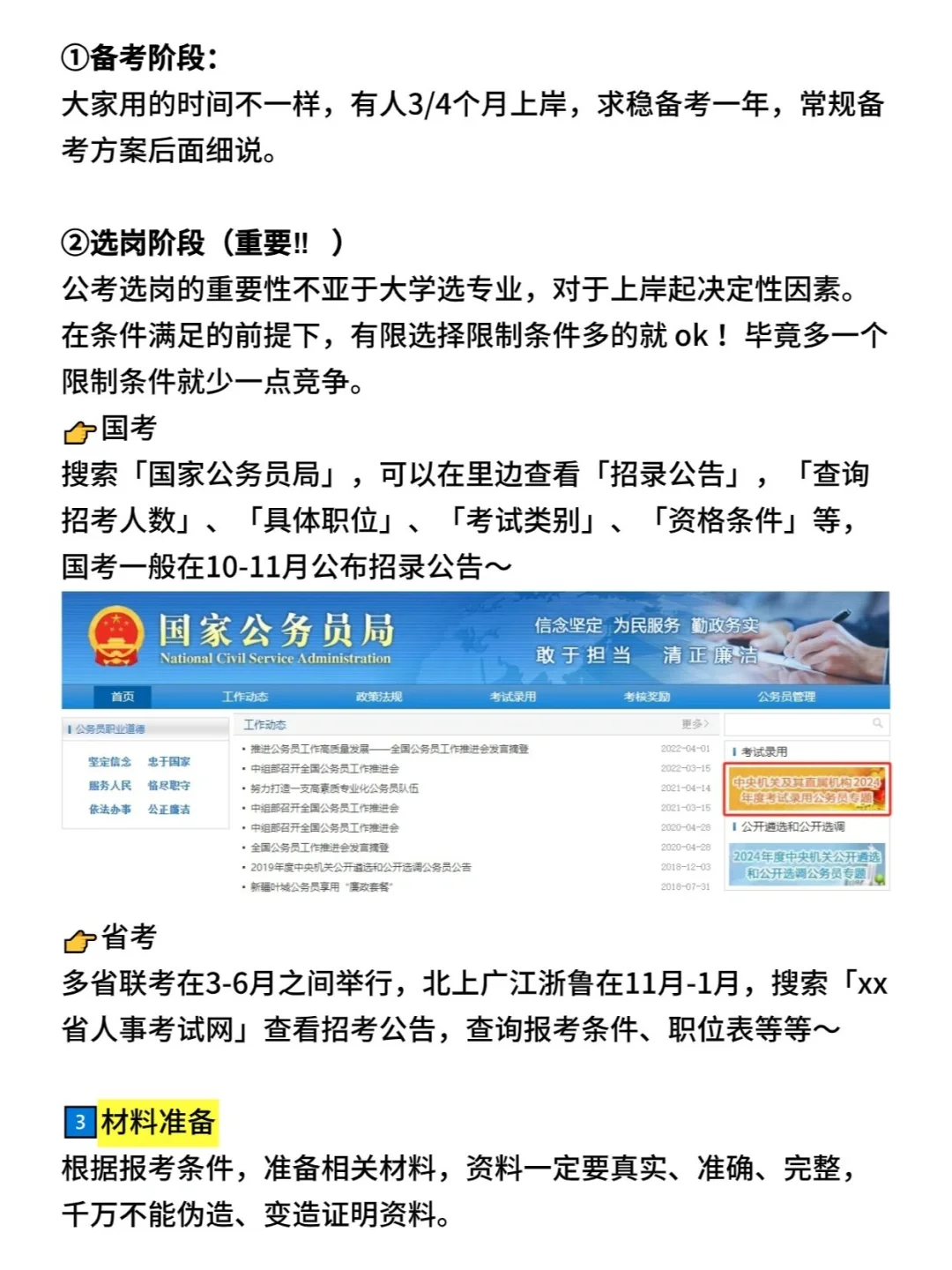 真心话‼️真的不要什么都不懂就备考公务员 是不是头脑一热 听到大家说公务员铁饭碗千好万好 脑袋一热就开始考公 考公务员玩的就是信息差 多了解一些少走弯路 ✅国省考报考条件 一般来说,基本上学历在专科及其以上就可以报考公务员,虽然专科的岗可能稍微少一些。 年龄要求18以上,35岁以下,但是在读非即将毕业的大学生不能报考,要等到大四上学期,才可以报名参加哦! 如果你还没毕业,可以提前准备一下!所以从大三上学期就开始备考了,应届生身份很重要,还没毕业的一定要把握住哦!②如果你已经毕业啦,有两种情况:情况一:毕业未超过2年且没交社保情况二:已缴纳社保 如果是第一种,还属于应届生,可以报考的岗多一些,竞争也相对小一些!所以千万别因为辅导员催你签公司就随便签个公司啥的! ✅基本流程 确定考公→备考→选岗→准备报考材料→网上报名→笔试→成绩查询→发布面试公告→面试→体检→政审→公示录用 备考阶段: 大家用的时间不一样,有人3/4个月上岸,求稳备考一年,常规备考方案后面细说。 选岗阶段(重要!!) 公考选岗的重要性不亚于大学选专业,对于上岸起决定性因素。在条件满足的前提下,有限选择限制条件多的就ok!毕竟多一个限制条件就少一点竞争 国考 搜索「国家公务员局」,可以在里边查看「招录公告」,「查询招考人数」、「具体职位」、「考试类别」、「资格条件」等,国考一般在10-11月公布招录公告~ 省考 多省联考在3-6月之间举行,搜索「xx省人事考试网」查看招考公告,查询报考条件、职位表等等~ 材料准备 根据报考条件,准备相关材料,资料一定要真实、准确、完整,千万不能伪造、变造证明资料。 备考方案 ①备考时间线 一般学习规划分为4个阶段 (1)听课阶段,打好基础→(2)名师课程,强化提升→(3)刷题阶段,查漏补缺→(4)全真模拟,实战演练。 ②考公考什么? (1)一般来说,无论是国考、省考还是多省联考,都会涉及到笔试和面试。 (2)笔试:行测+申论 基本参加行测+申论两科笔试的,笔试成绩按各占50%的比例合成。参加行测+申论+专业知识三科笔试的,笔试成绩按35%、35%、30%的比例合成。(3)面试:包括结构化面试(为主)、结构化小组面试、无领导小组面试等多种表现形式。 需不需要报班 如果你没有自制力、备考没有方向,那其实报个班确实是个比较好的选择,跟着老师学,选岗、考情、规划、答疑一条龙服务。#公务员上岸 #国考备考 #国考省考 #经验分享 #公务员 #备考 |