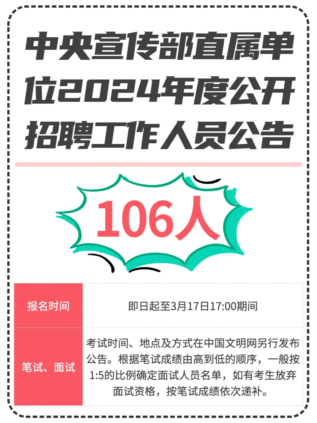 中央宣传部直属单位2024年度公开招聘106人 ✨ 招聘范围 (一)招聘应届毕业生岗位:招聘对象须为2024年全国普通高等学校非定向应届毕业生(不含委培、部队院校, 一般应在2024年7月底前取得相关学历、学位,含两年择业期内未落实工作单位的高校毕业生)。报考人员在校期间所修课程全部合格,毕业时须取得与最高学历对应的学历学位证书;岗位要求的专业条件为报考者即将获得的最高学历对应专业。其中,京内生源指入读高校前为北京市常住人口户籍、不需要进京落户的学生。留学人员须符合教育部留学服务中心关于留学人员就业报到及落户政策要求。 京内生源考生可以报考符合条件的京外生源岗位。 (二)招聘社会人员岗位:报考人员在校期间所修课程全部合格,毕业时已取得与最高学历对应的学历学位证书;岗位要求的专业条件为报考者已获得的最高学历对应专业。社会人员需具有北京市常住人口户籍。 ✨ 招聘岗位及条件 中国共产党历史展览馆等23家中宣部直属单位计划招聘106名工作人员。 #公告 #湖北招聘 #招聘 |