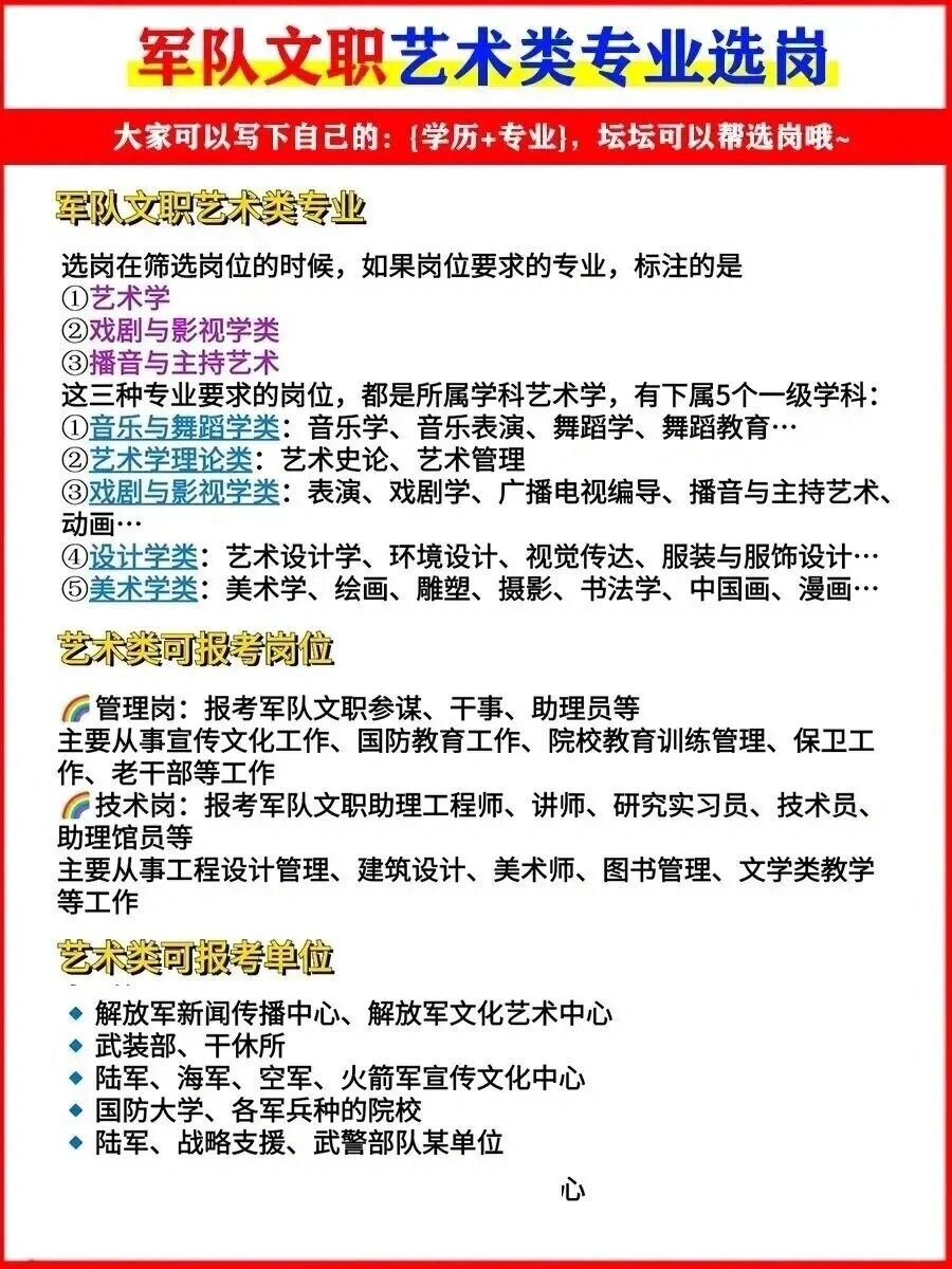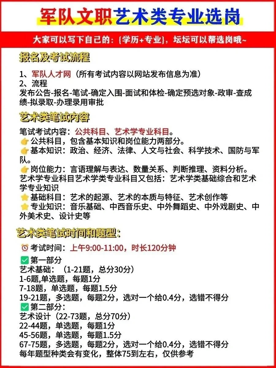 艺术类专业简直太适合军队文职了❗️❗ [哇R]军队文职招艺术类的专业的岗位,主要涉及到的专业有:音乐类、舞蹈类、戏剧与影视类等。[赞R][赞R] [放大镜R]艺术岗主要包括: 美术技能型岗位、体育学技能型岗位、舞蹈技能型岗位、舞台美术设计技能型岗位、戏剧与影视技能型岗位、音乐技能型岗位。[庆祝R][庆祝R] [放大镜R]艺术类岗位笔试包括: (1)公共科目 (2)艺术学专业科目 -------------------------------------- [学生党R]【公共科目】包括: (1)基本知识:政治、经济、法律、人文与社会、科学技术、国防军队; (2)岗位能力:言语理解与表达、数量关系、判断推理、资料分析; [学生党R]【艺术学专业科目】包括: (1)艺术学类-基础综合 (2)艺术学类-专业知识 ♥艺术学类-基础综合部分:主要包括艺术的本质与特征、艺术的起源、艺术的功能与艺术教育、艺术创作、艺术作品、艺术鉴赏等基础理论知识;[玫瑰R] ♥艺术学类-专业知识部分:艺术类专业技术岗位人员考试的专业内容统称;[玫瑰R] [放大镜R]各专业分别为: (1)音乐包括:音乐基础理论、中西音乐史、重要艺术家及其经典作品赏析; (2)舞蹈包括:舞蹈基础理论、中外舞蹈史、重要重要艺术家及其经典作品赏析; (3)戏剧与影视包括:戏剧及影视(含播音)基础理论、中外戏剧史、中外影视史; (4)美术包括:美术基础理论、中外美术史; (5)艺术设计包括:艺术设计概念、中外艺术设计史; (6)舞台美术设计包括:舞台美术的概念、中外舞台美术史。 [放大镜R]面试环节:主要考大家的求职动机和适岗能力,还有专业技能等。 大家如果不知道自己的专业适不适合报文职岗位,可以写下:[向右R]{学历+专业},冉冉帮选岗哦~[红色心形R][红色心形R] #军队文职 #军队文职经验 #军队文职选岗 #2024军队文职 #文职考试#女生必看 |