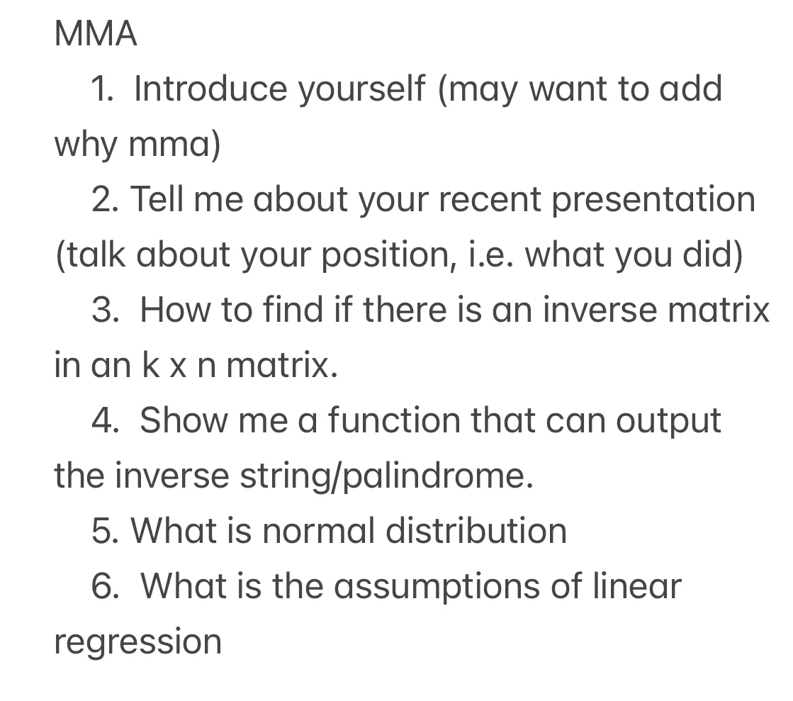 MMA考了一些linear algebra和基础coding的问题,MFRM则多数都是bg和为什么对金融感兴趣(可能因为我自己的bg不太涉及fin)