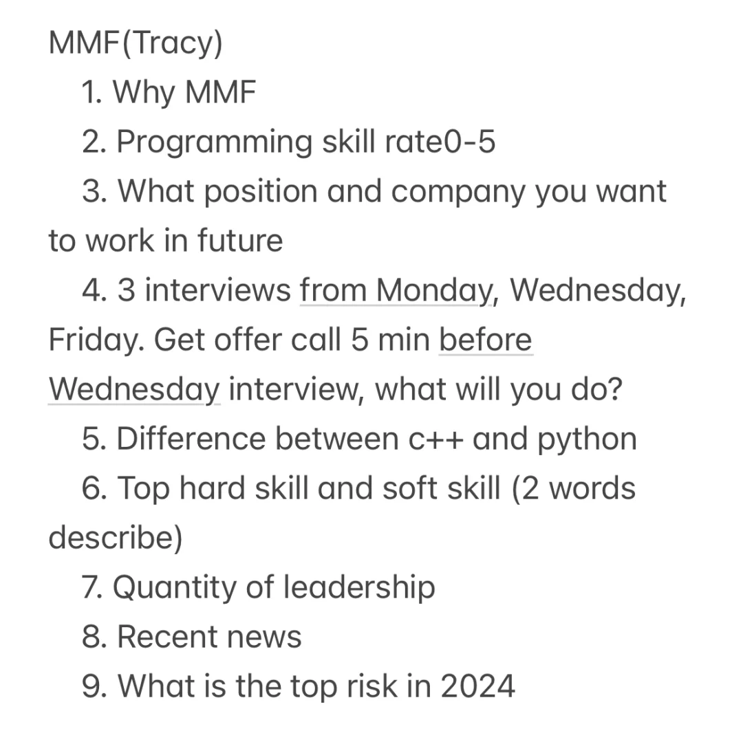 MMF的话没有什么tech题目,Tracy更多像是对待工作招聘一样进行提问