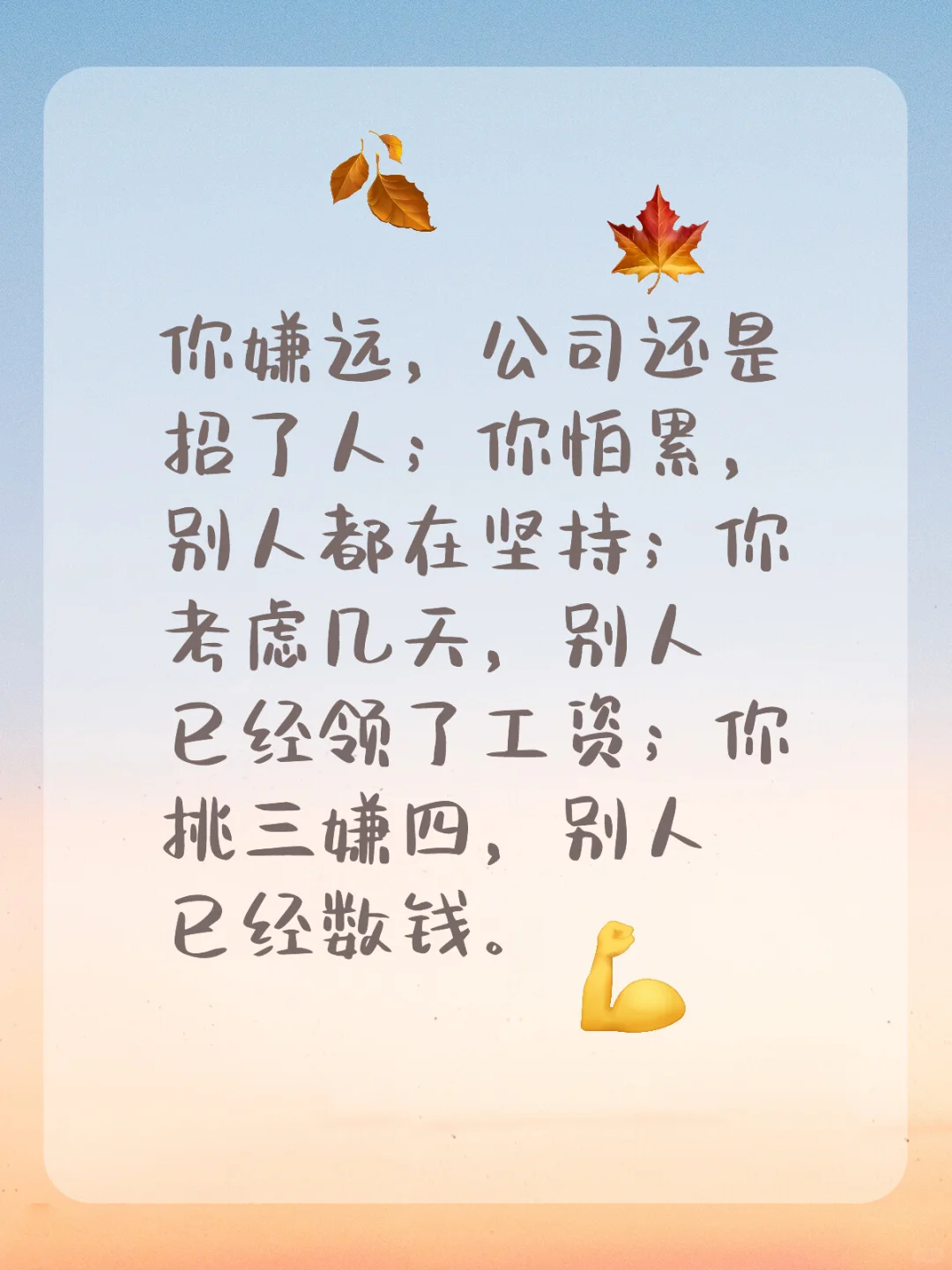 你嫌远,公司还是招到人了!你怕累,别人都在坚持着。你考虑几天,别人已经领到工资了!你挑三嫌四的时候,别人已经开始数钱了
