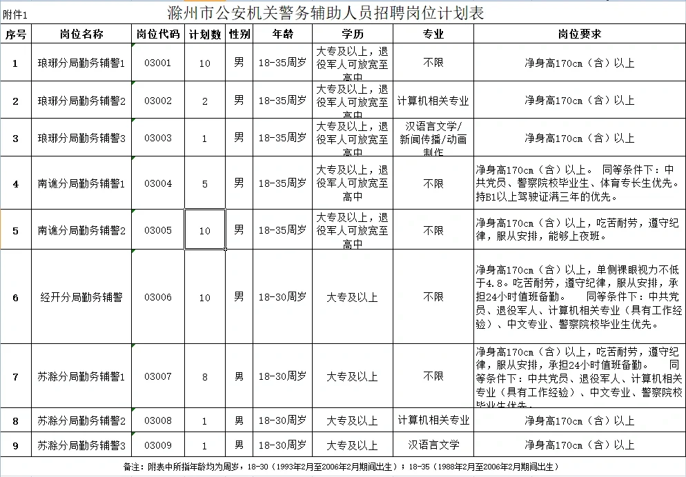 本次招聘警务辅助人员243名,其中琅琊分局13名,南谯分局15名,经开分局10名,苏滁分局10名,全椒县局30名,来安县局50名,天长市局20名,定远县局50名,凤阳县局35名,明光市局10名1、报名时间:2024年3月4日至2023年3月8日(上午8:30-11:30,下午2:30-5:00),逾期将不再接受报名