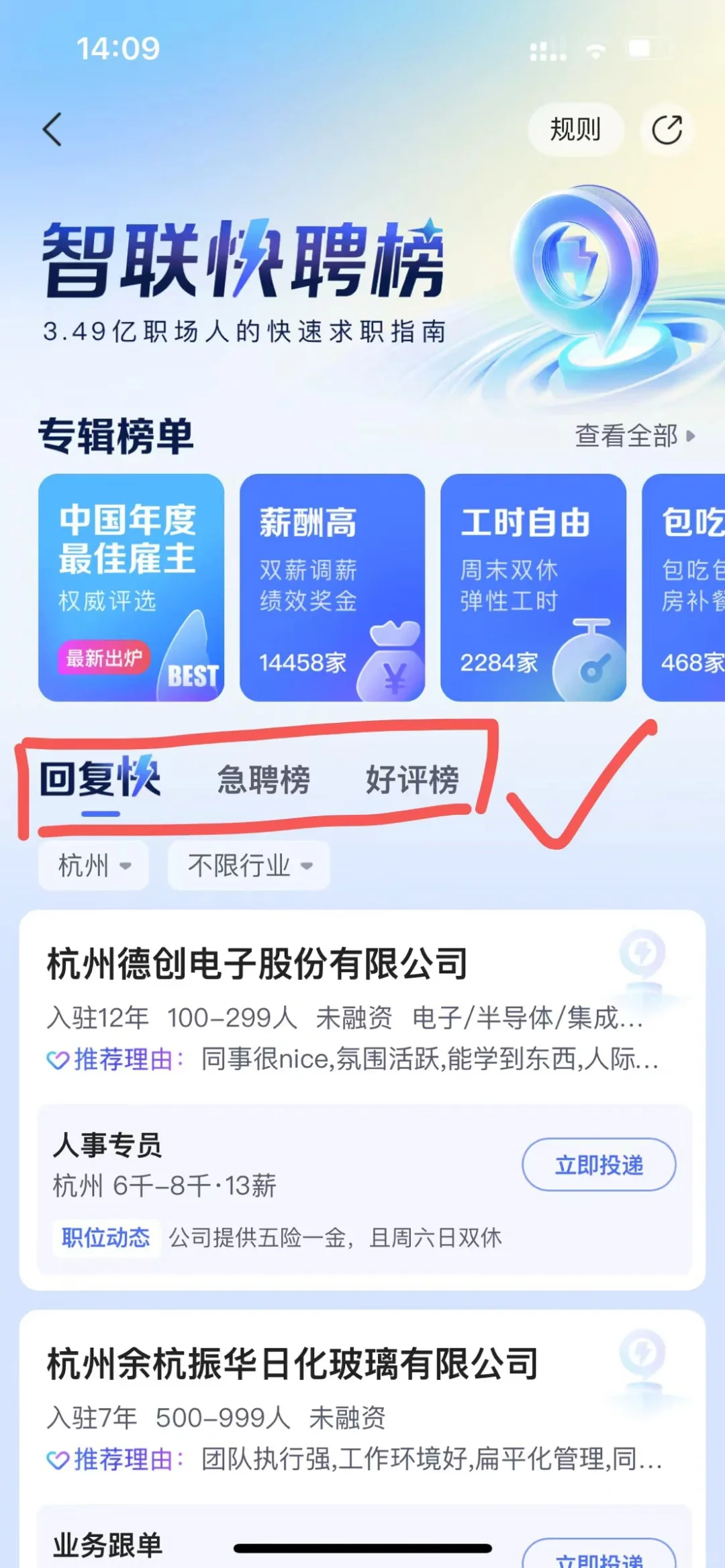 他们最近推出的“快聘榜”, 有三个快捷按钮:“回复快”、“急聘榜”和“好评榜”,方向和需求都很明确聚焦,主打一个:快!