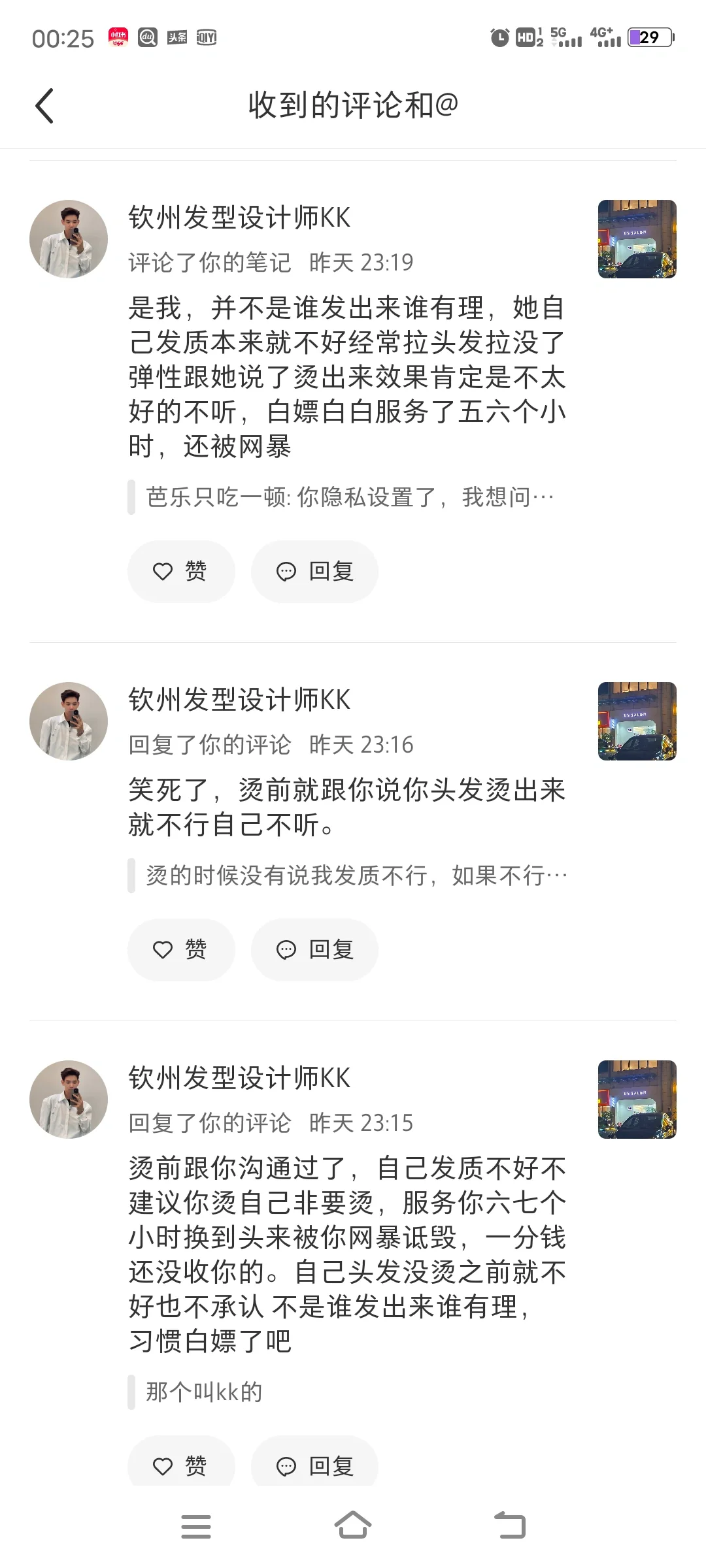今天这个给给我做头发的垃圾KK在我上一条笔记评论区说当时不建议我做我非要做?你说这种假话小心被天收你。说我白瓢?你这种技术免费我都不做,我们消费者是花钱变漂亮的,不是拿我头发去给你练手的,你技术好的话几千块都有人找你做头发,你没信心做好你可以不做我生意我绝对不勉强,我绝不会拿我头发去博,上一次他们店应该是店长私信我,说要给我经济补偿,我没回复,补偿有什么用?可以换回我原来的发质吗?我去花钱的说我白瓢,现在谁花不起几百块,太恶心了,技术不行人品还差[弱R]