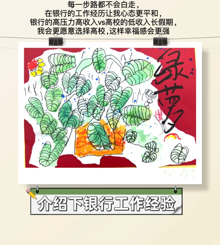 ⏰ 七年时间,我干过银行的很多岗位,桂圆,客户经理助理,客户经理,总行。每个银行每个岗位的情况都有所不同,每个人的能力个性资源也不同,不好直接建议。你可以问问身边的人,收集相关信息,避免信息差。当然,你还年轻,去高校的话,35岁之前都可以考。先去看看世界的繁华,多赚点钱,多经历些也是可以的,毕竟每一步路都不会白走。在银行工作过六七年,会让我心态更平和,银行的高压力高收入vs高校的低收入长假期,我会更愿意选择高校,这样幸福感会更强。如果一毕业就进入高校,我可能会抱怨收入低。但是一毕业就进入,那我可能在晋升上会有更高的追求和更好的发展空间。你可以参考亲朋好友,学长学姐们的意见,再自行判断。