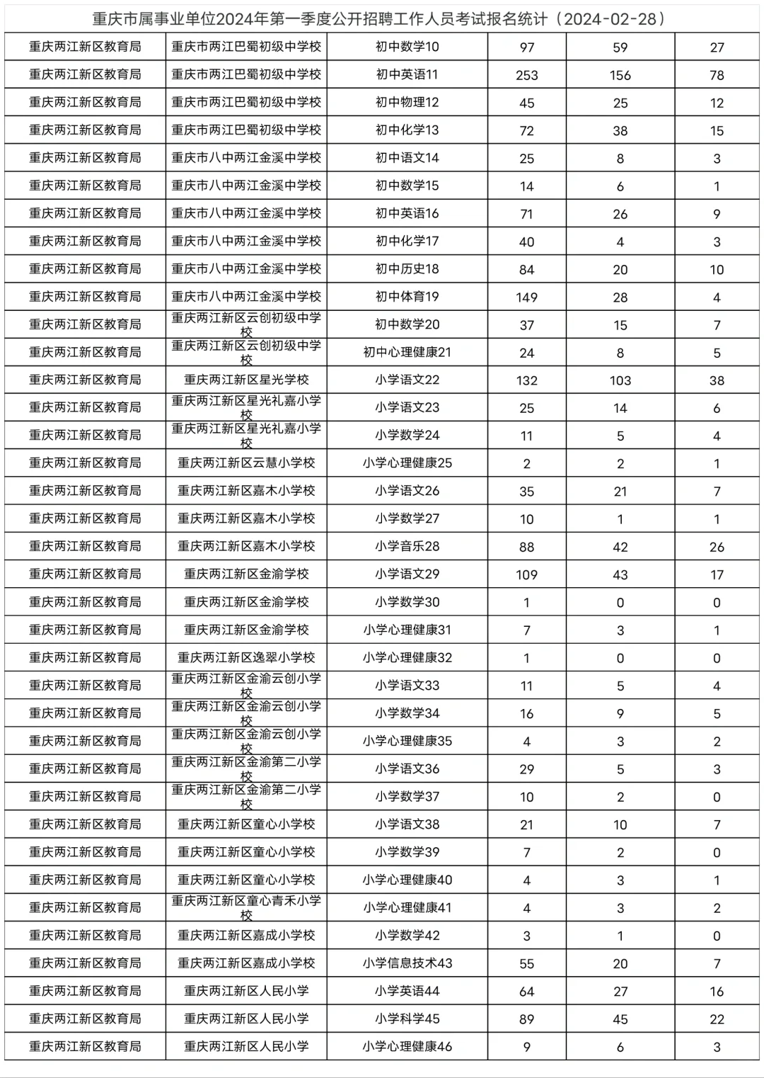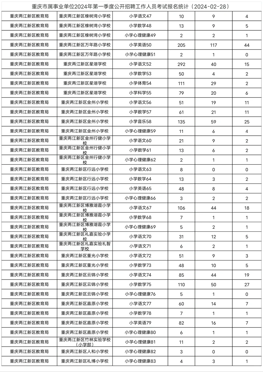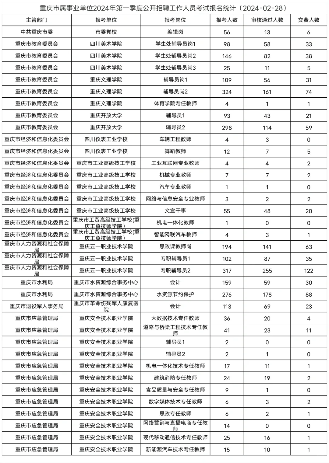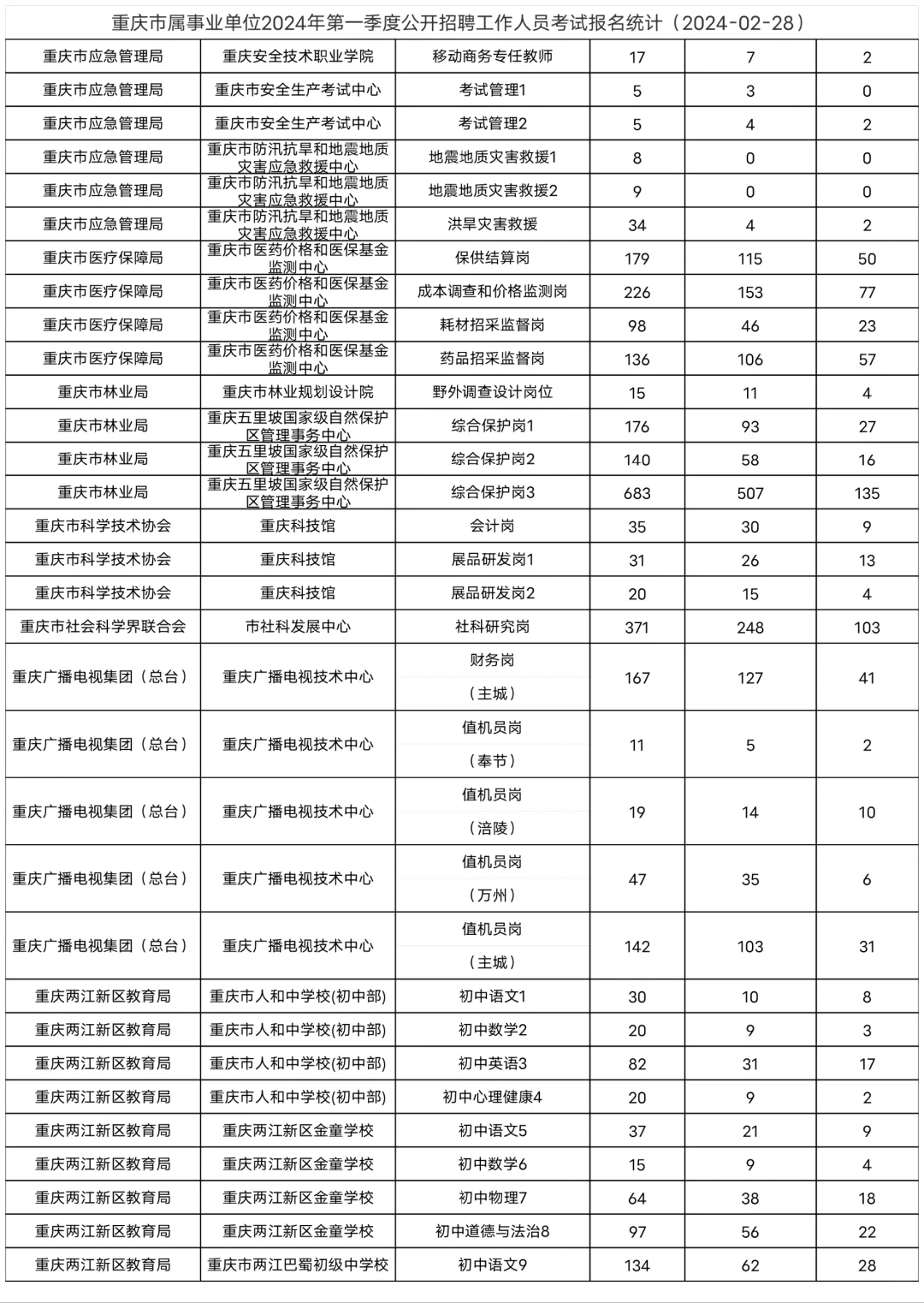 重庆市属事业单位第一季度报名人数统计,截止到2024年2月28日,报名人数最多的三个岗位