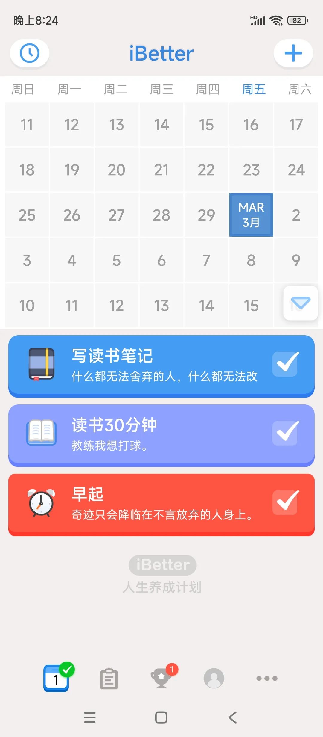 最近添加了ibetter习惯打卡app,帮助自己践行早读跑,运动等微习惯。