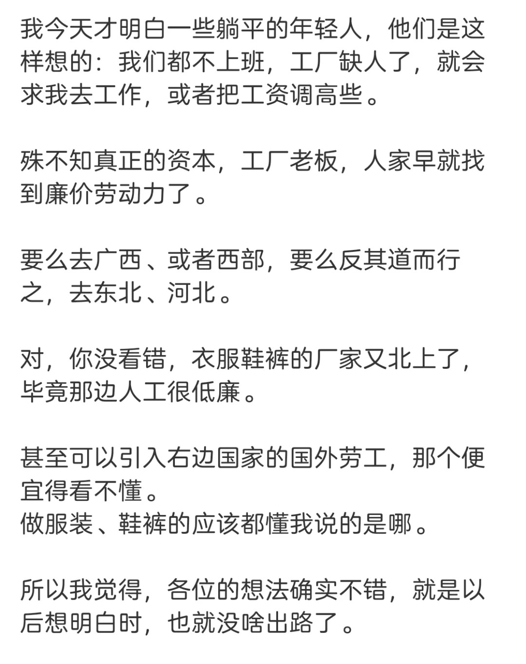 现在的状况就是,你躺平就请躺好,老板去更廉价的地方开厂丈招人了