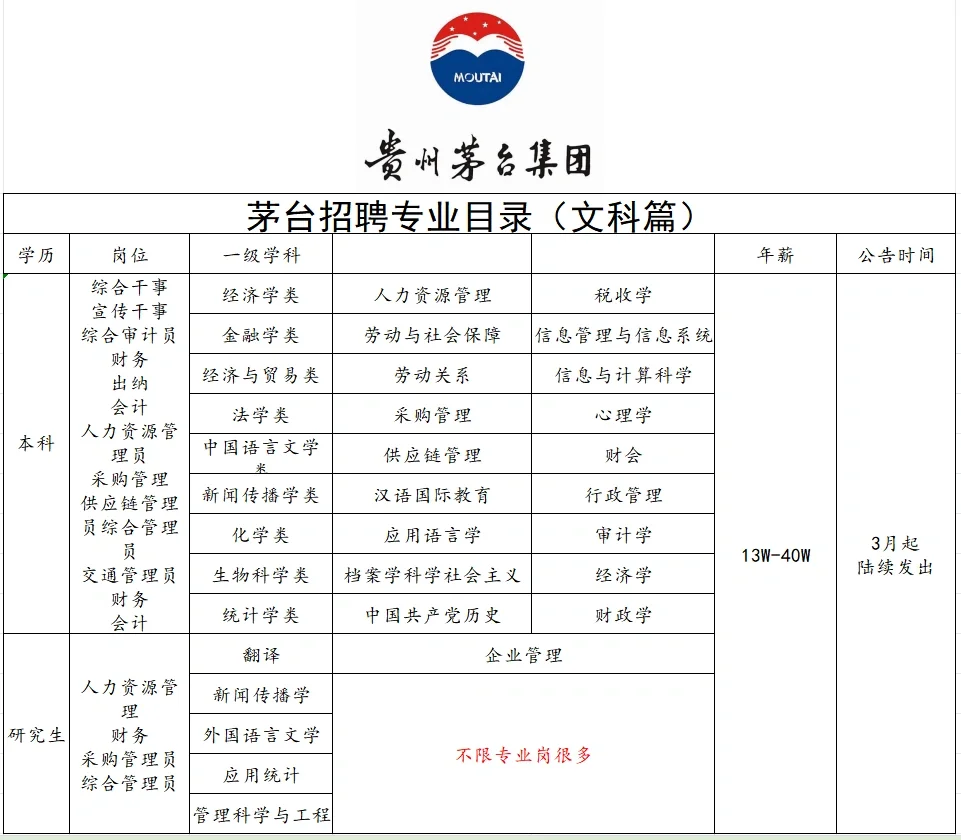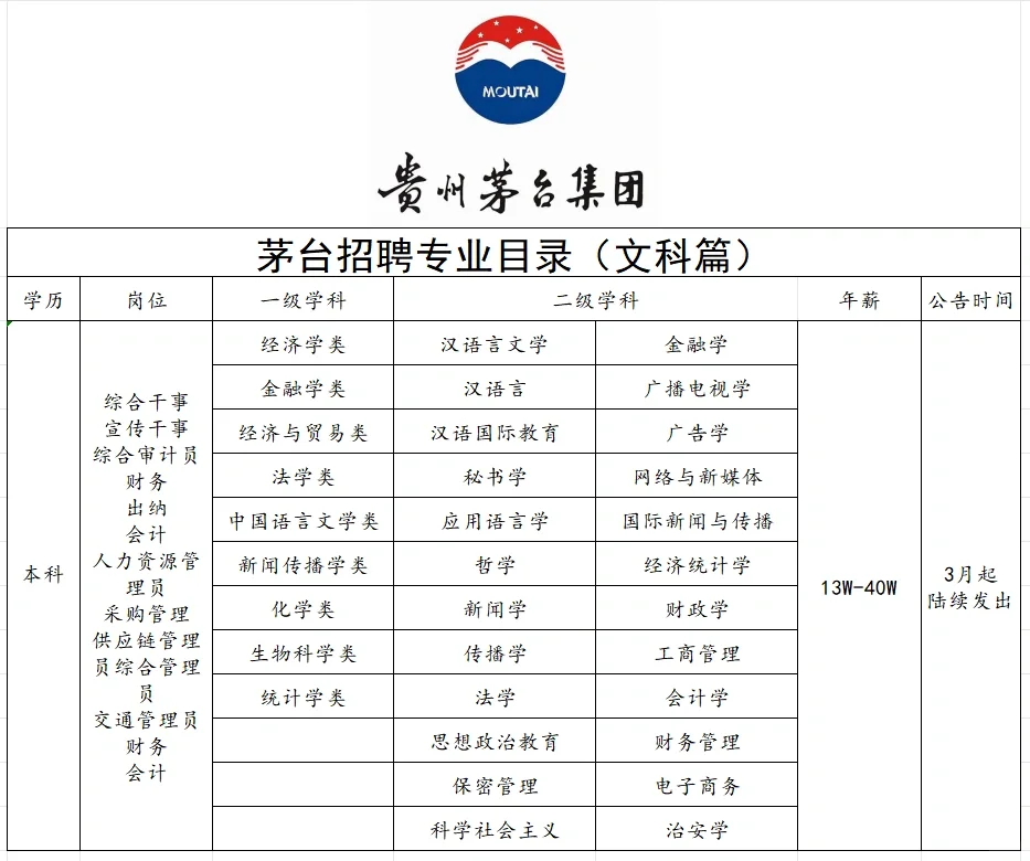 茅台集团招聘专业目录(理➕文➕师范➕艺术)