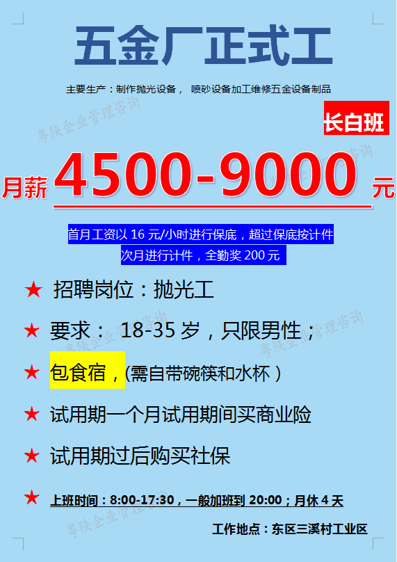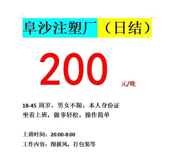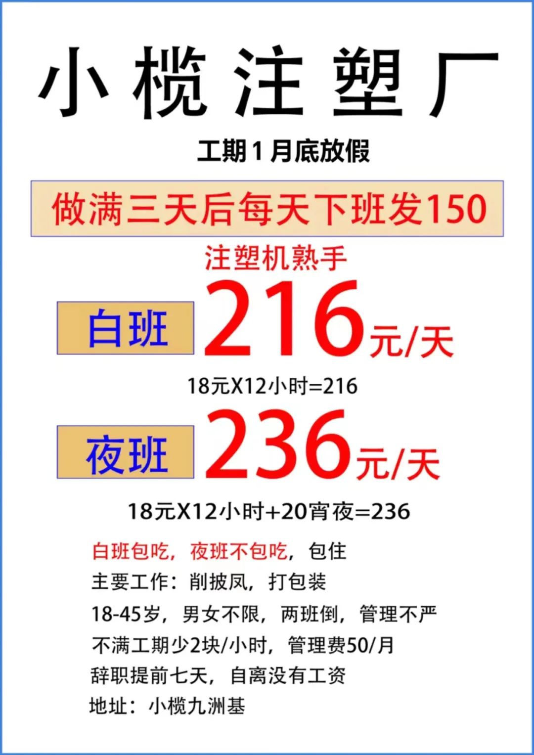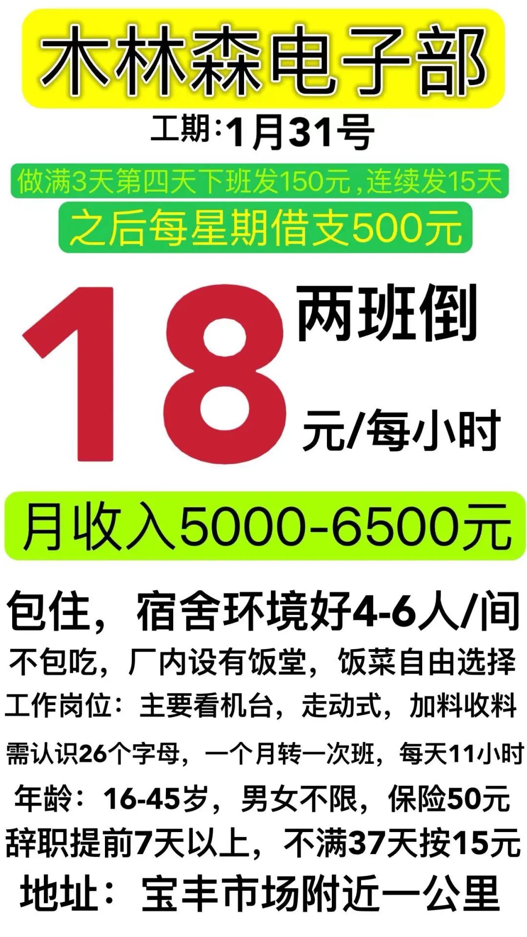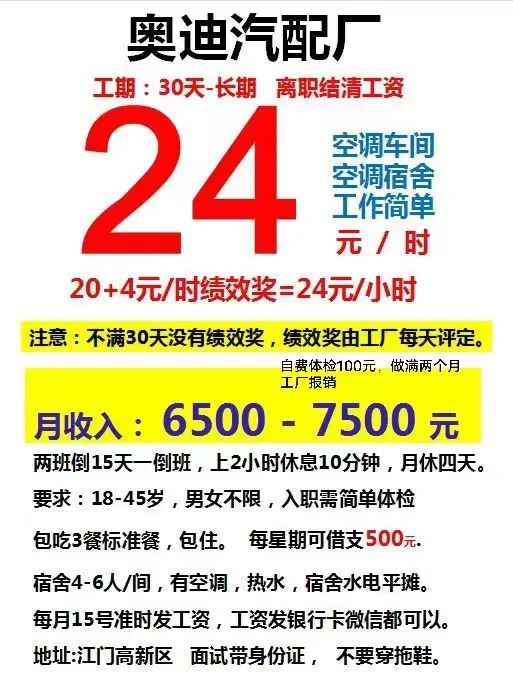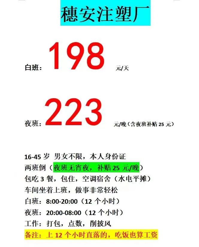 满18-39男女,两班倒(08.00-20.00/20.00-08.00),认识26个字母,不扣保险、不扣管理费、水电费扣8元/天,身份证复印件3张,无犯罪案底记录。工作满第4天下班每天可发150元,工作满7天可借支300元,离职可结清所有工资