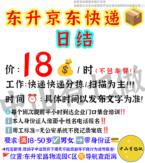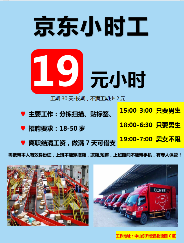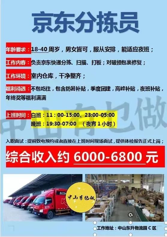 【东升京东临时社会工非暑假工】月收入6K-7K 不包吃住! 位置:中山东升宏昌物流园C区可导航查距离