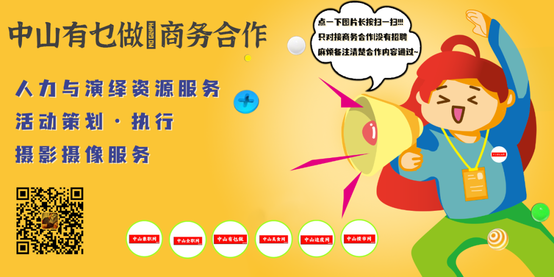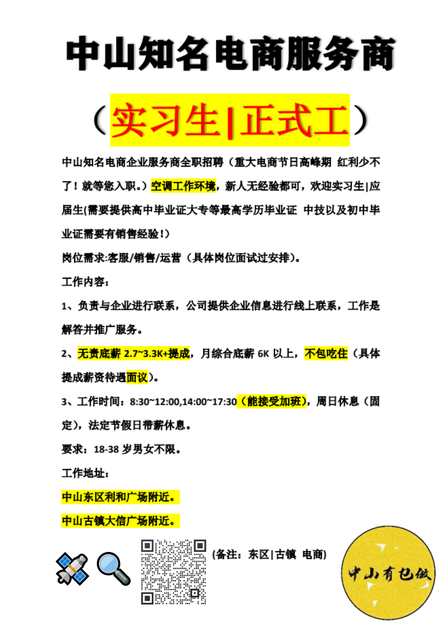 3、由于网络虚假招聘信息泛滥及会有广告不当行为,中山学生地带小编虽已竭尽所能对信息的真实性进行审核,但仍不能保证所有信息100%的真实性。若您在浏览过程中发现有可疑信息(保证金&报名费涉及个人的金钱个人权益信息广告过于涉及负面等),请与中山学生地带公众号客服联系,客服将迅速进行甄别处理。