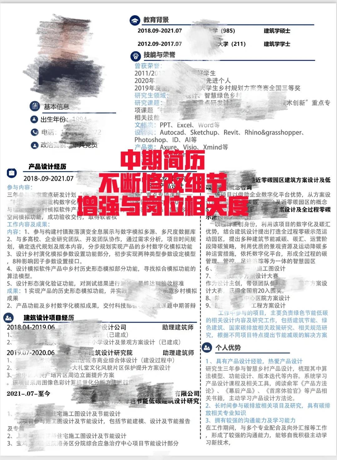 第三个阶段,建筑行业和整个市场急转直下,转行难度肉眼可见直线上升,面试邀约变少,同时面试通过率变低,再次进入焦虑状态,原有的简历完全不能满足现在激烈的求职市场,在这过程中,老婆及朋友都帮助我修改简历,一个hr朋友专业指导了简历的全部细节,经过那阵子的简历修改,几乎每次投递都会有回应,同时在招聘软件上更新简历后,有猎头和hr开始主动联系,一个月也有几次面试邀约,积累了大量的面试经验,我这次的转行岗位就是猎头主动打电话联系的,经过两轮的面试,最终成功转行双碳数字化顾问