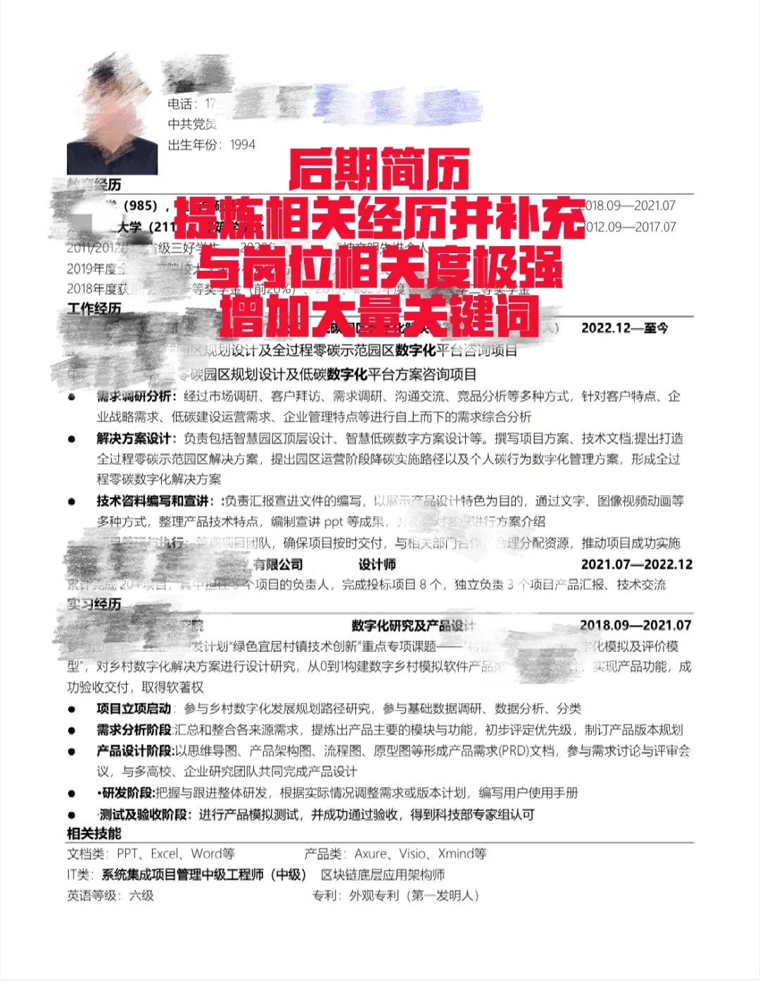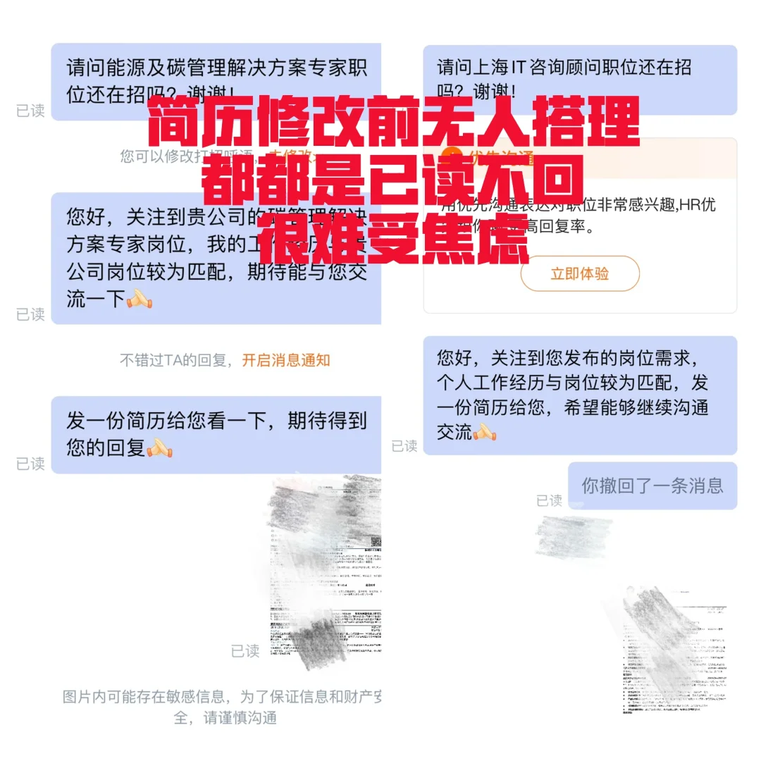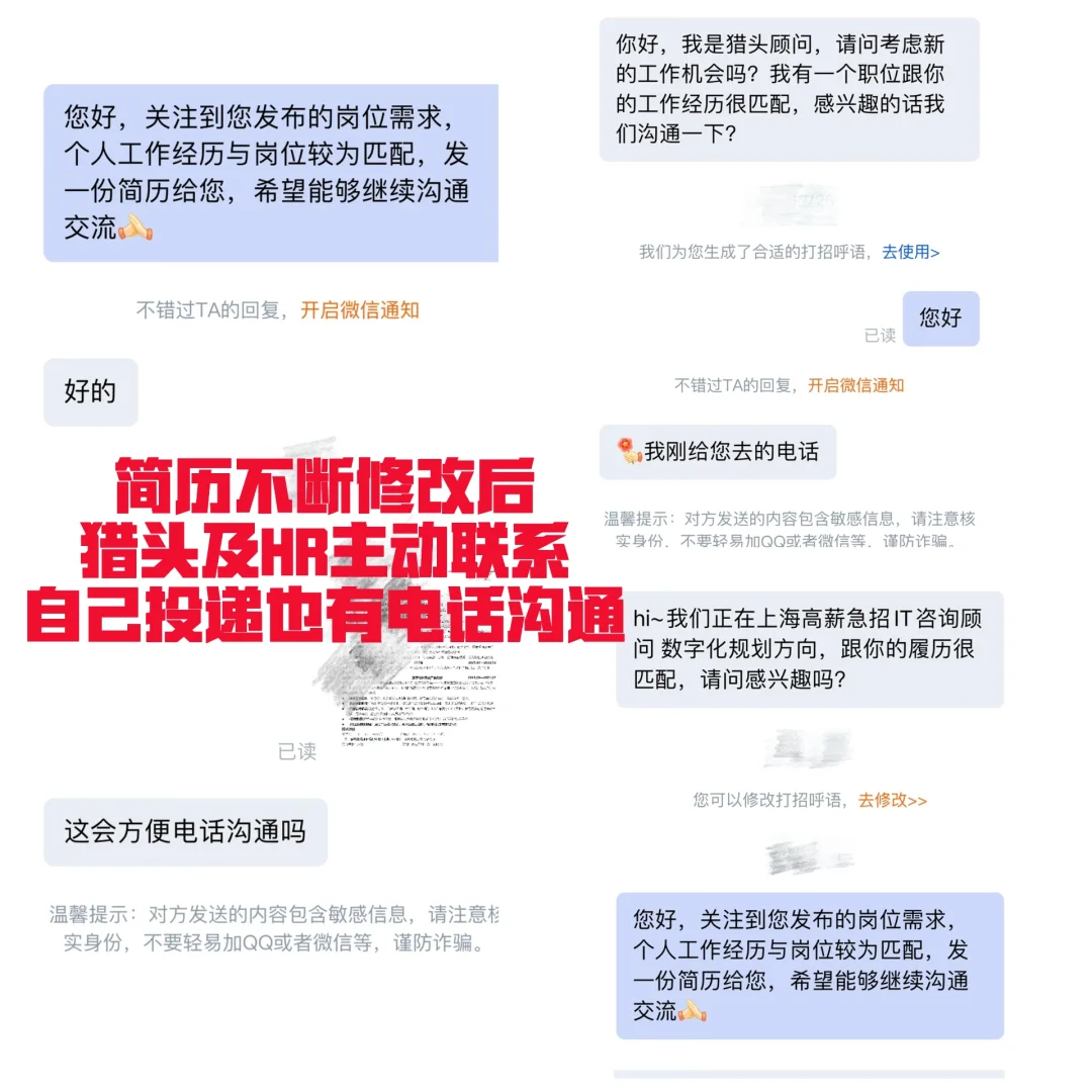 转行过程中,简历修改是最重要的一步,这一步决定了你有没有面试邀约,面试修改前后招聘软件上的反馈差别非常明显,修改前一周都没有一个消息,修改后,每天打开软件都会有一些公司的主动联系,大家一定要重视简历的修改