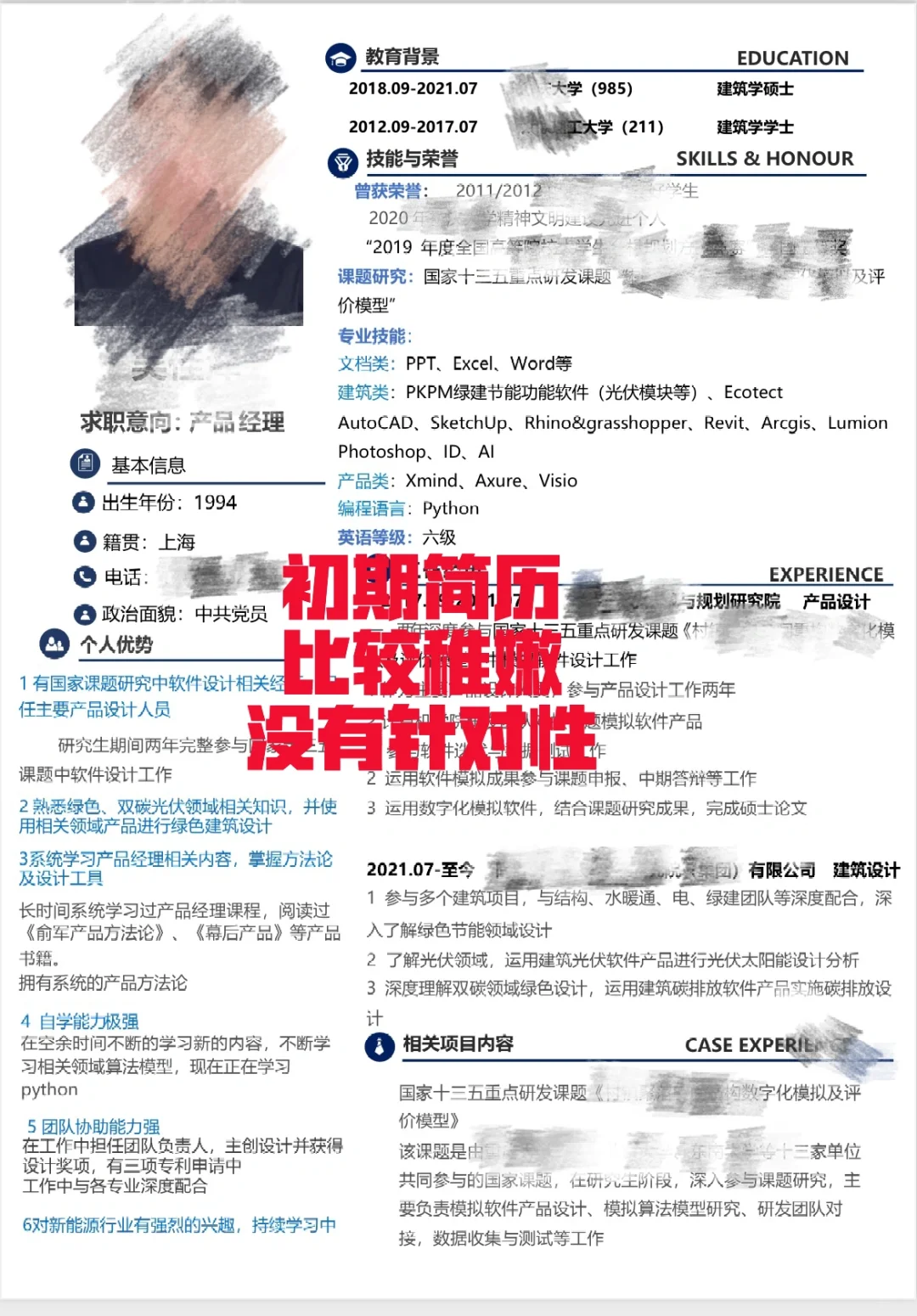 第一个时期,当时刚刚有了转行的念头,按照自己的理解,快速写了一版,当时觉得心意满满,很快转行给了我迎头一棒,我花了两周时间罗列了近百家投递公司,投递后无一回应,我陷入自我怀疑中
