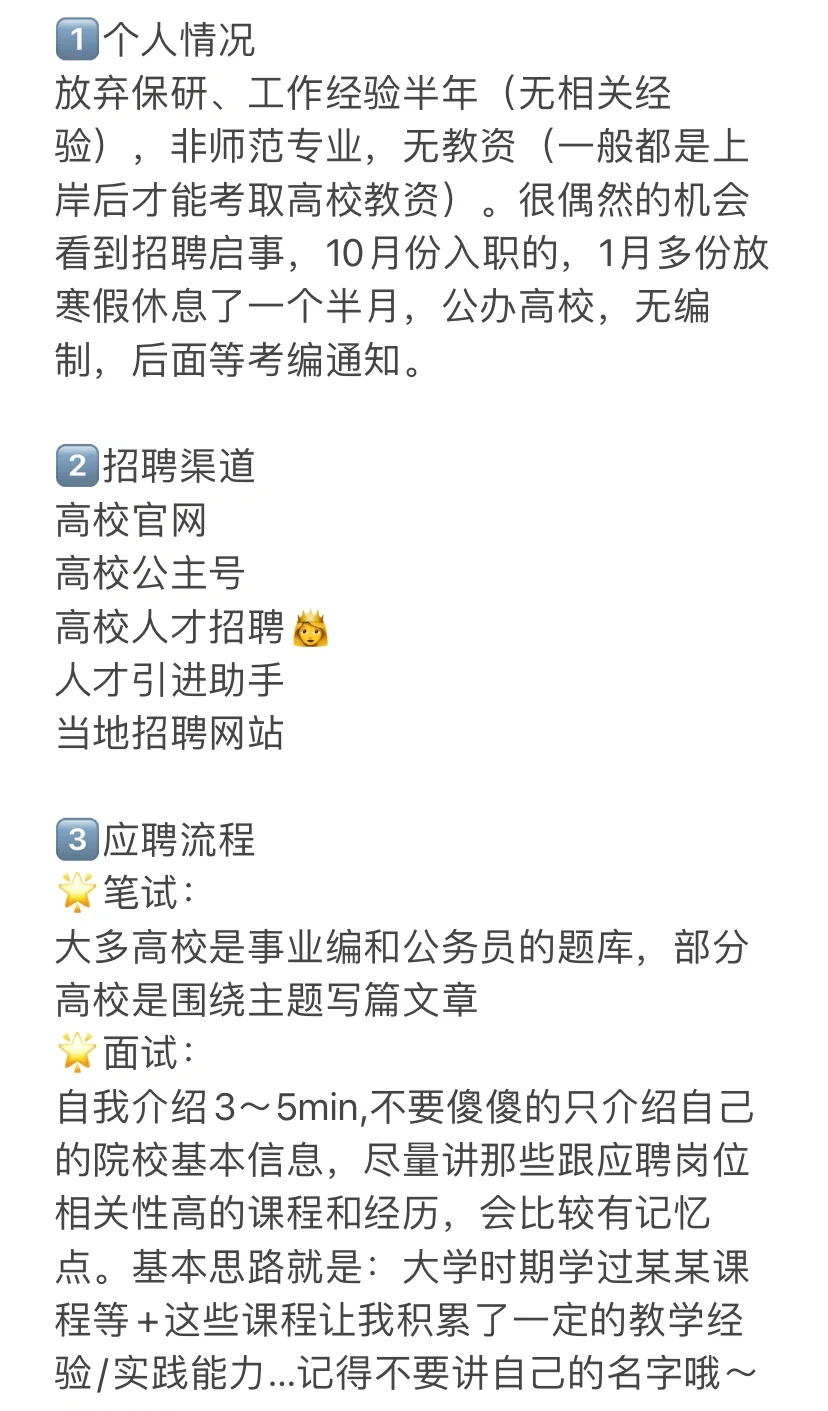 本科学历,工作经验半年(无相关经验),非师范专业,无教资(一般都是上岸后才能考取高校教资)。很偶然的机会看到招聘启事,10月份入职的,1月多份放寒假休息了一个半月,公办高校,无编制,后面等考编通知。