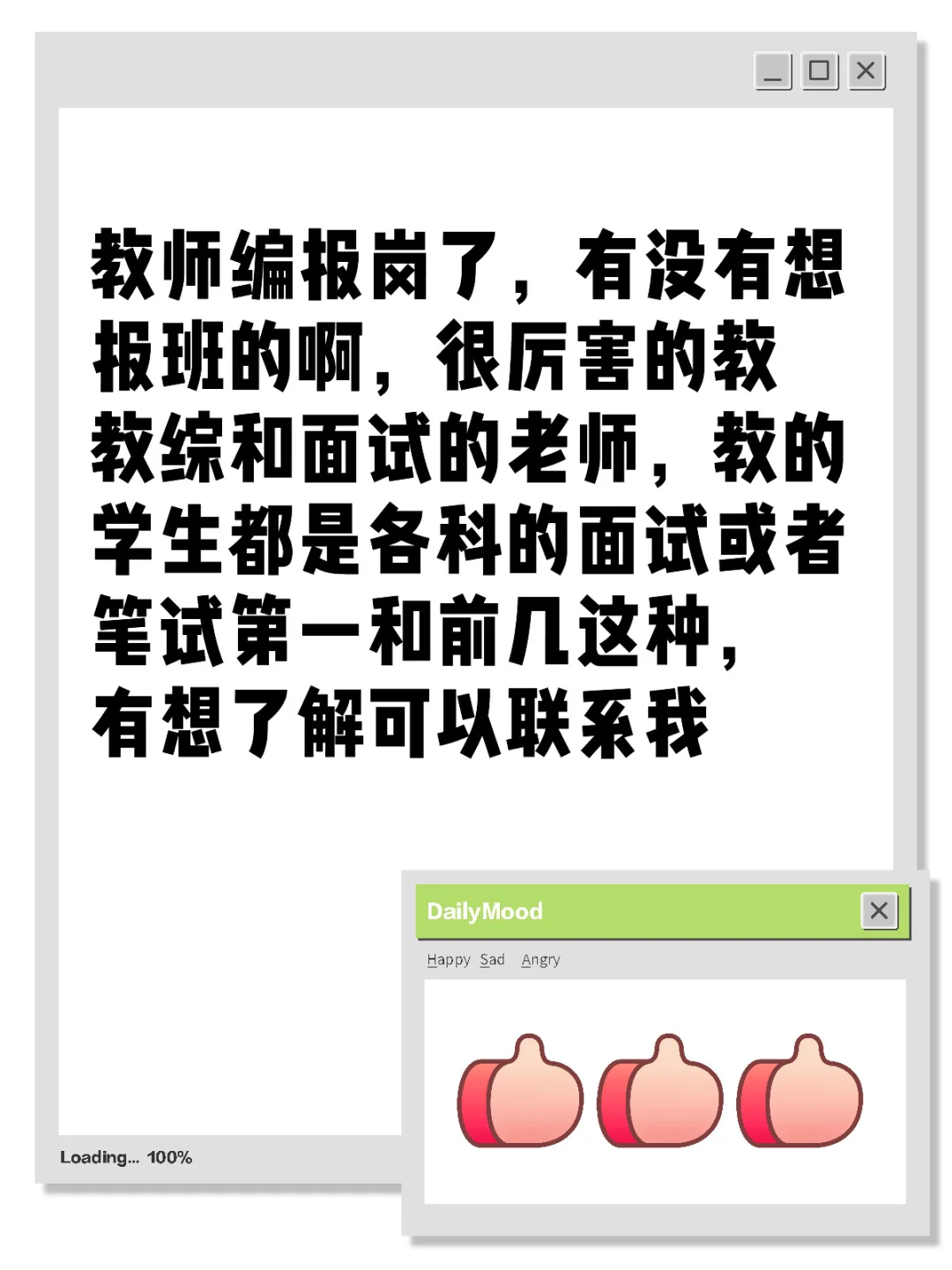 教师编报岗了,有没有想报班的啊,很厉害的教教综和面试的老师,教的学生都是各科的面试或者笔试第一和前几这种,有想了解可以联系我