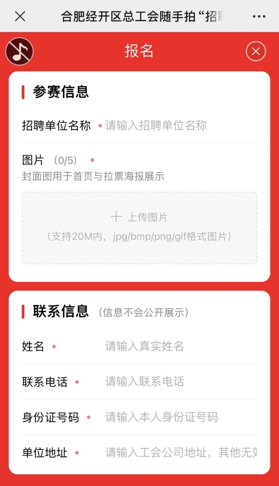 步骤四、填写个人真实信息(姓名、电话、身份证号、单位{或单位地址}),上传“招聘通知”相关照片,最后点击“确认提交”就可以静静等待审核啦!