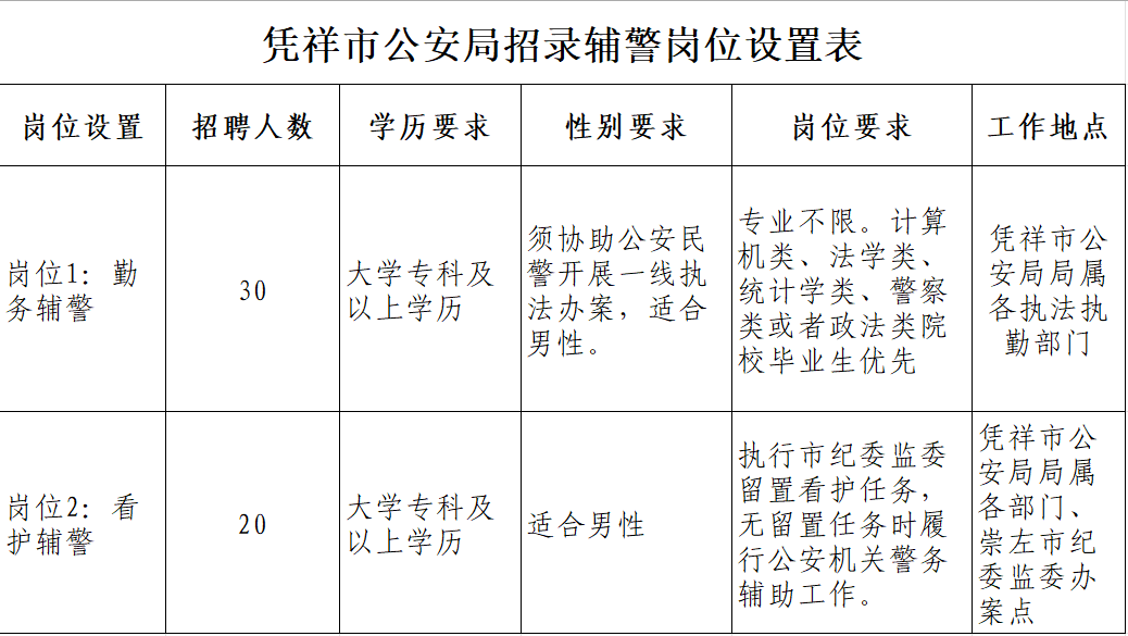 原标题:共50人!凭祥市公安局2024年面向社会公开招聘警务辅助人员公告