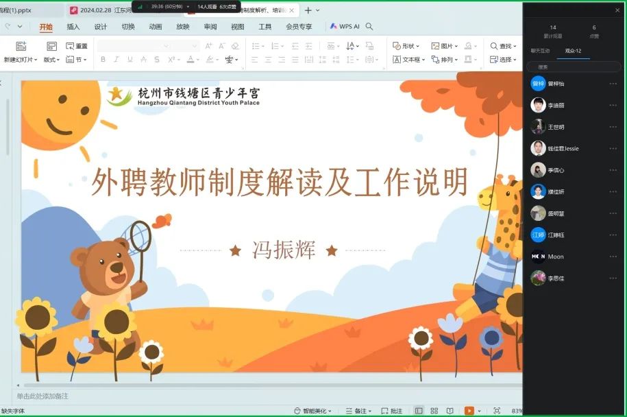 沿江中心负责人张吟老师围绕“教学”和“安全”两个关键词展开讲解。希望老师们能老课新教、与时俱进;坚守安全底线,落实“三步自查”,并分享了突发情况的应急处理办法。张泽宇老师解读《杭州市钱塘区青少年宫外聘教师管理制度》;贾志超老师以武术课为例,就始业教育的内容进行分析讲解;周孙羽老师解读了《外聘教师待遇实施办法》。最后,会议安排了新进外聘教师入职前交流及教学点参观活动。