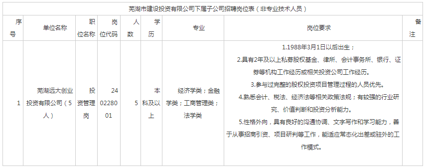因工作需要,芜湖市劳动保障人力资源有限公司受芜湖市建设投资有限公司委托,拟为下属企业(芜湖远大创业投资有限公司)面向社会公开招聘企业正式员工,现将有关事项公告如下: