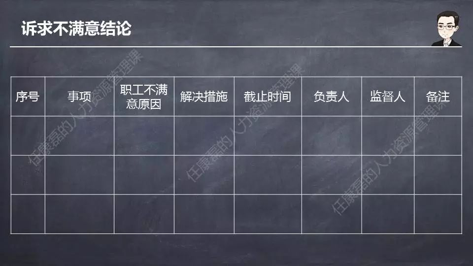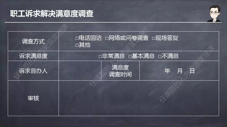 诉求事项处理完后,人力资源部应及时向诉求提出者以及相关的职工做满意度调查。满意度可以设置为“满意”、“基本满意”、“不满意”三档,通过网络、电话或问卷的形式,让职工直接对处理结果给予评价,并由督办人签字备案。满意度调查表。